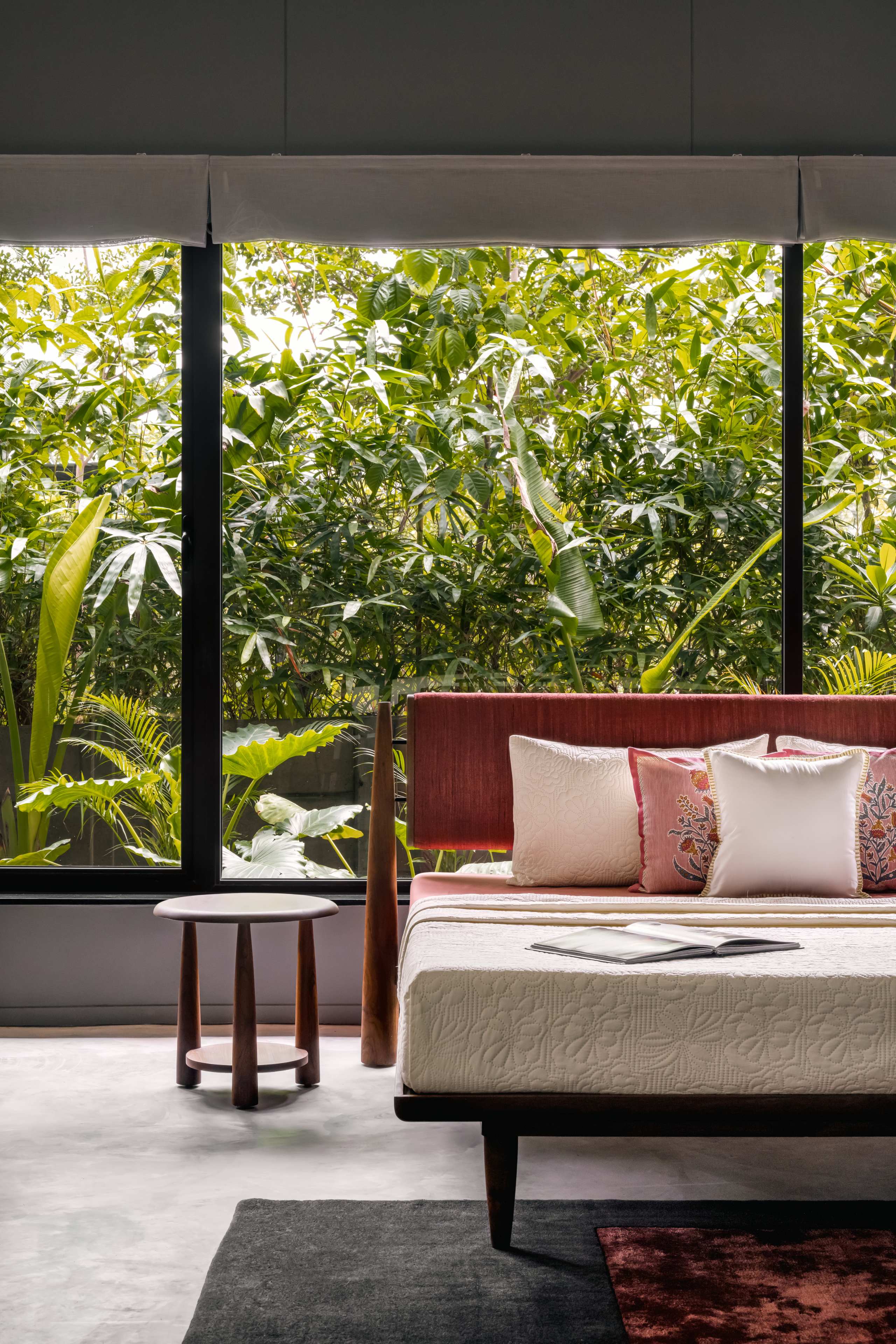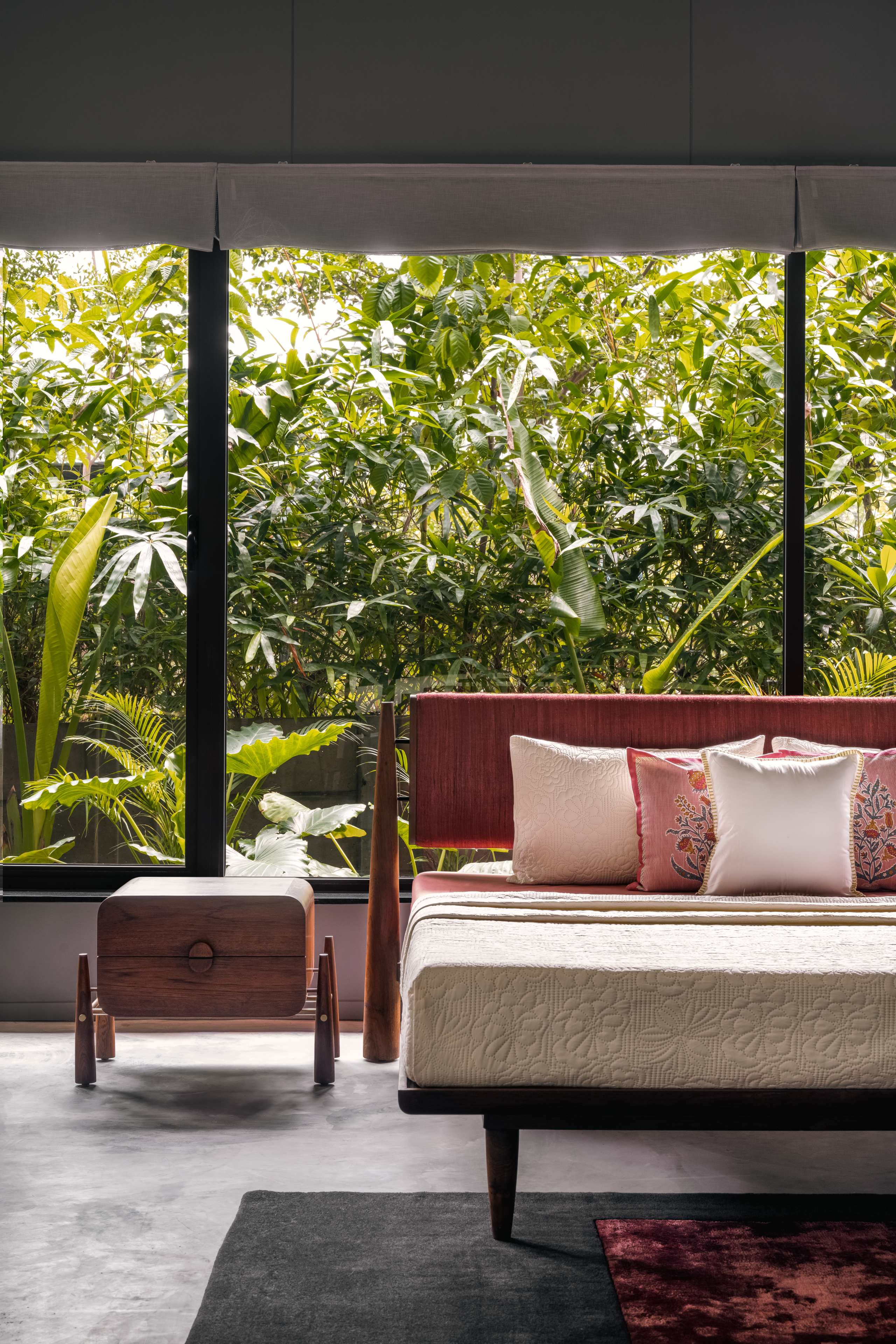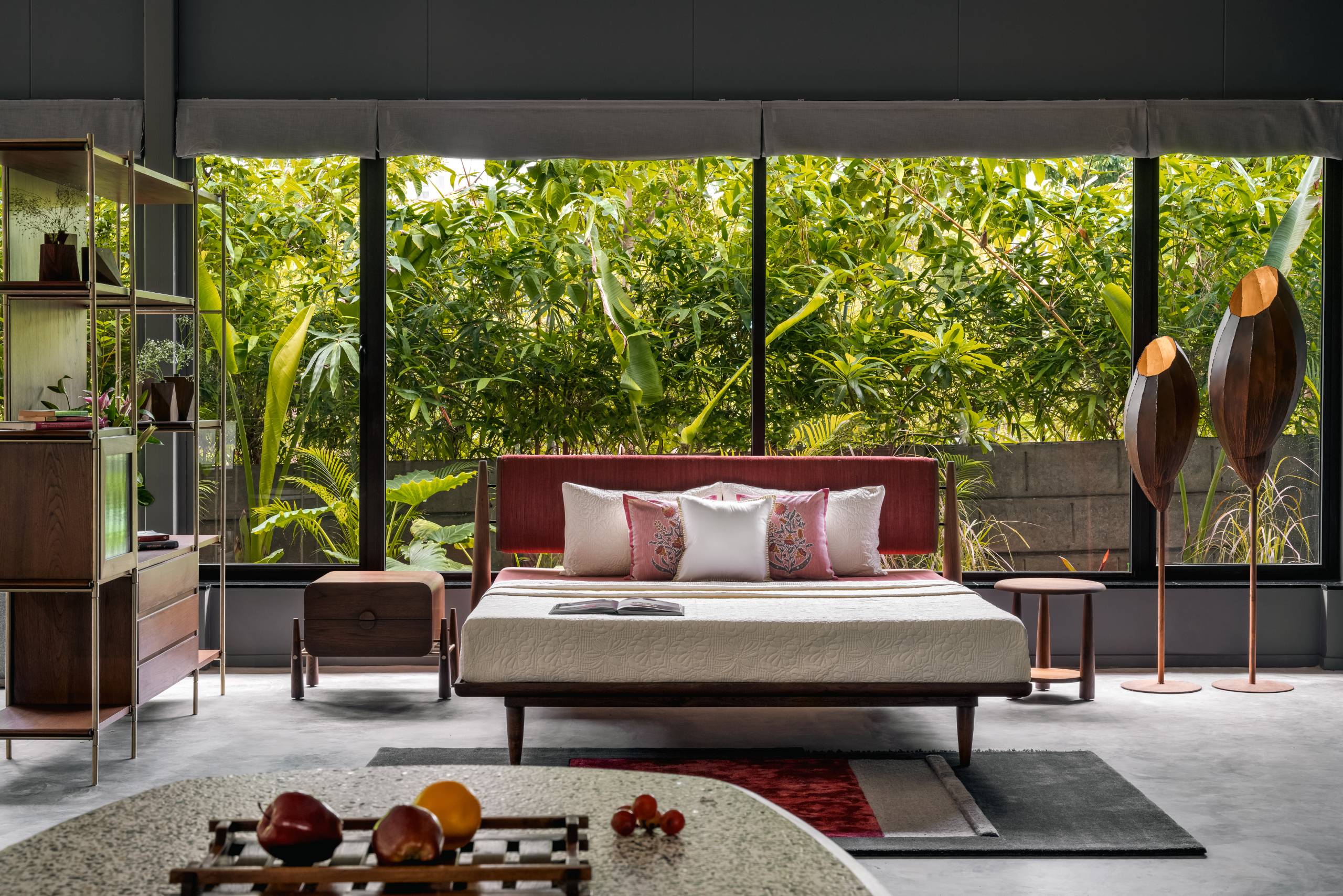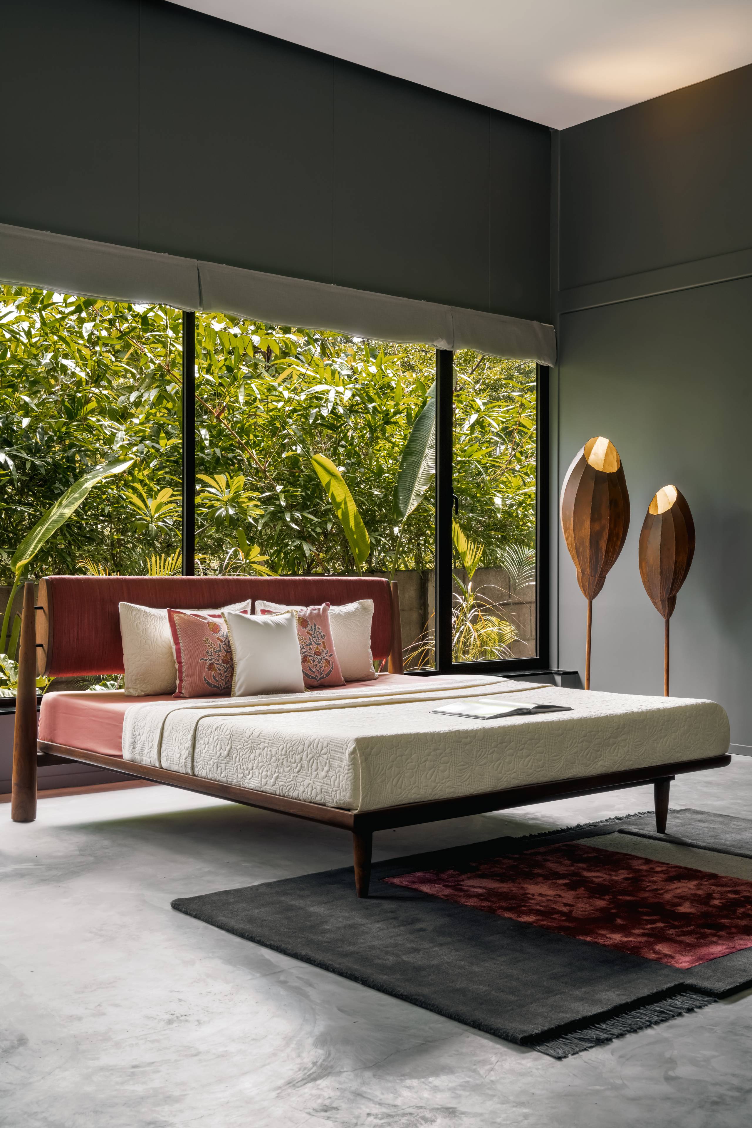 The Adobe Bed makes an immediate impression with its calm, poised presence. Its gently curved headboard and finely crafted wooden frame create a sense of lightness, while the soft upholstery adds warmth and texture. Each detail from the tapered legs to the wrapped silhouette reflects thoughtful craftsmanship. Customizable in finishes and fabrics, the Adobe Bed adapts effortlessly to any setting, transforming the room into a serene, inviting retreat.