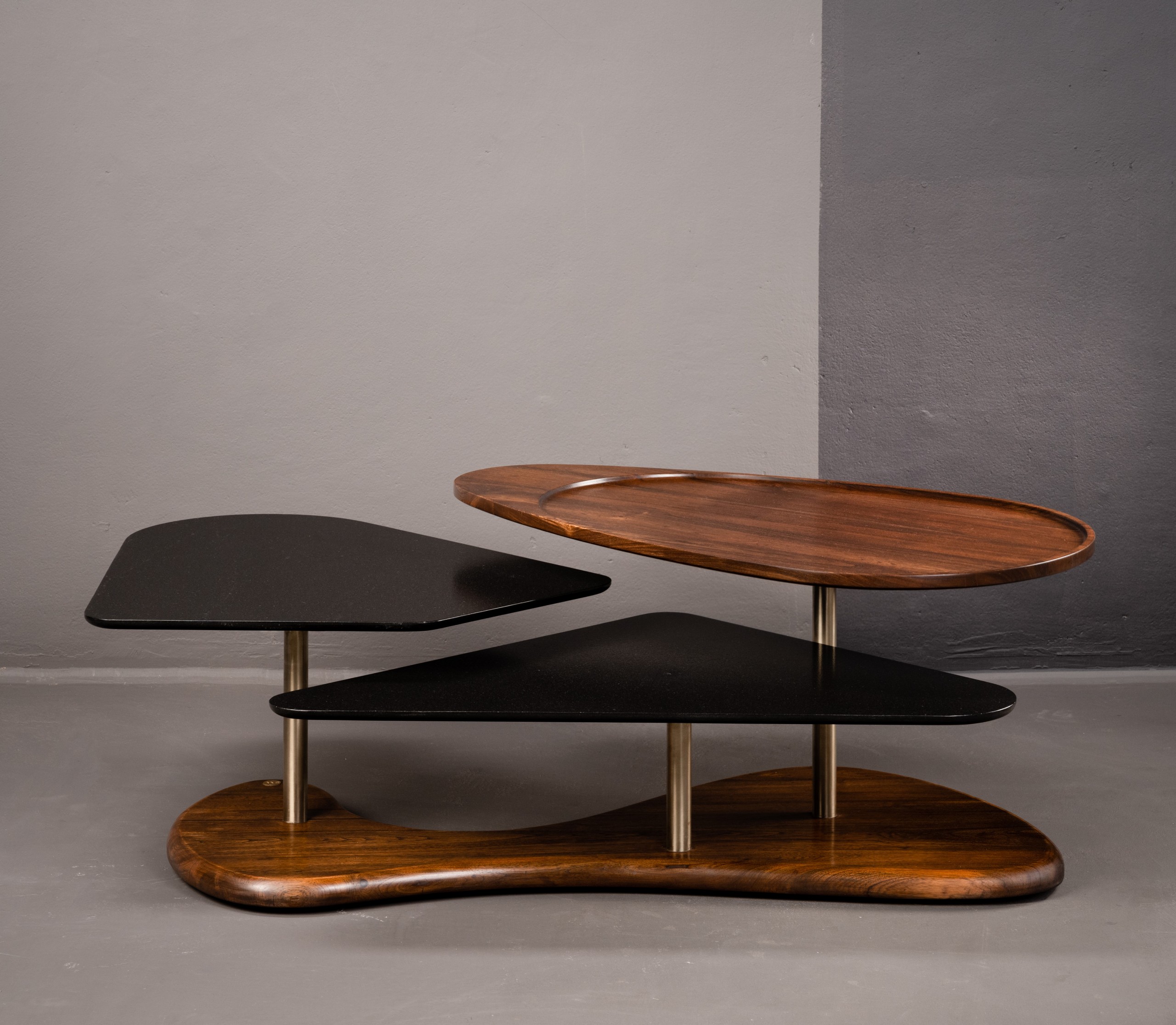 The Asyn table is a sculpture in itself despite what you put on it. The only wooden expressions lie in the base and the tray, both polished to look equally servile.