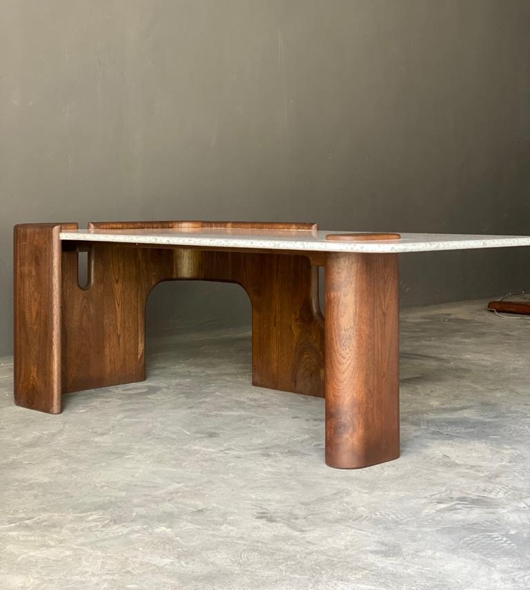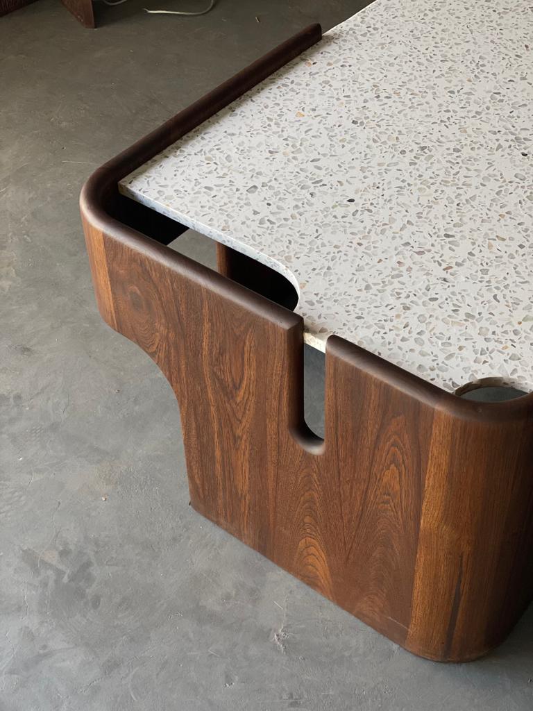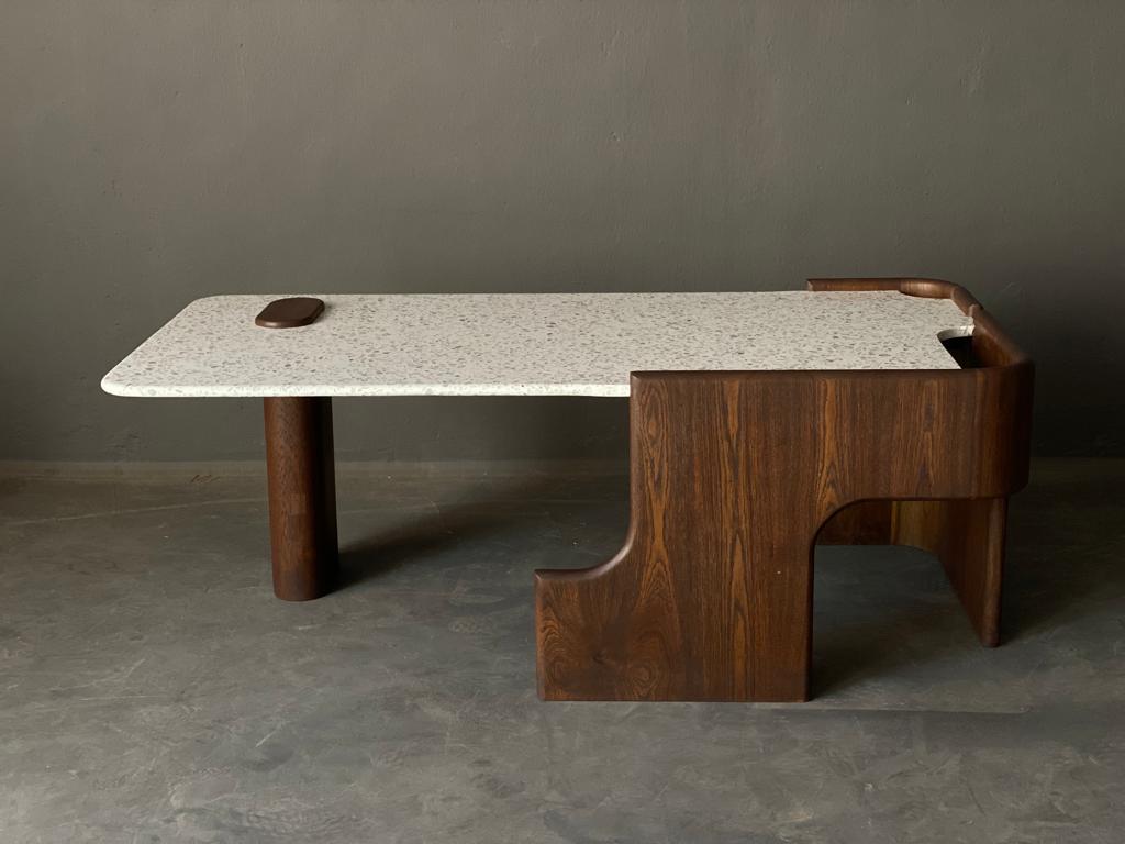 A table designed to hold presence in a room. Thoughtfully crafted with a sculptural wooden base and a smooth speckled top, it balances material warmth with refined detailing. The curved wooden structure wraps around one side, creating a sense of enclosure and form, while the rounded stone surface offers a calm plane for everyday use.