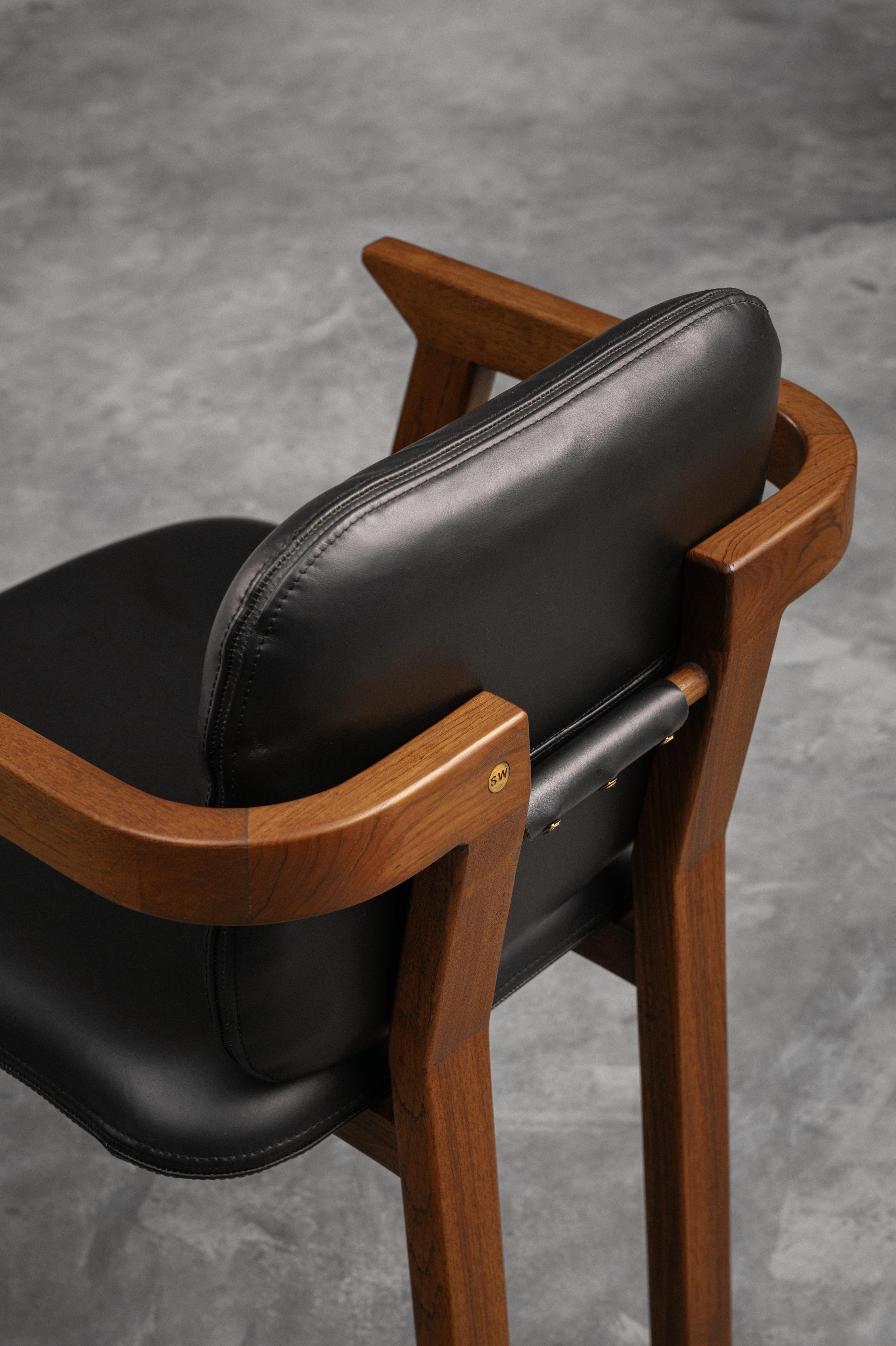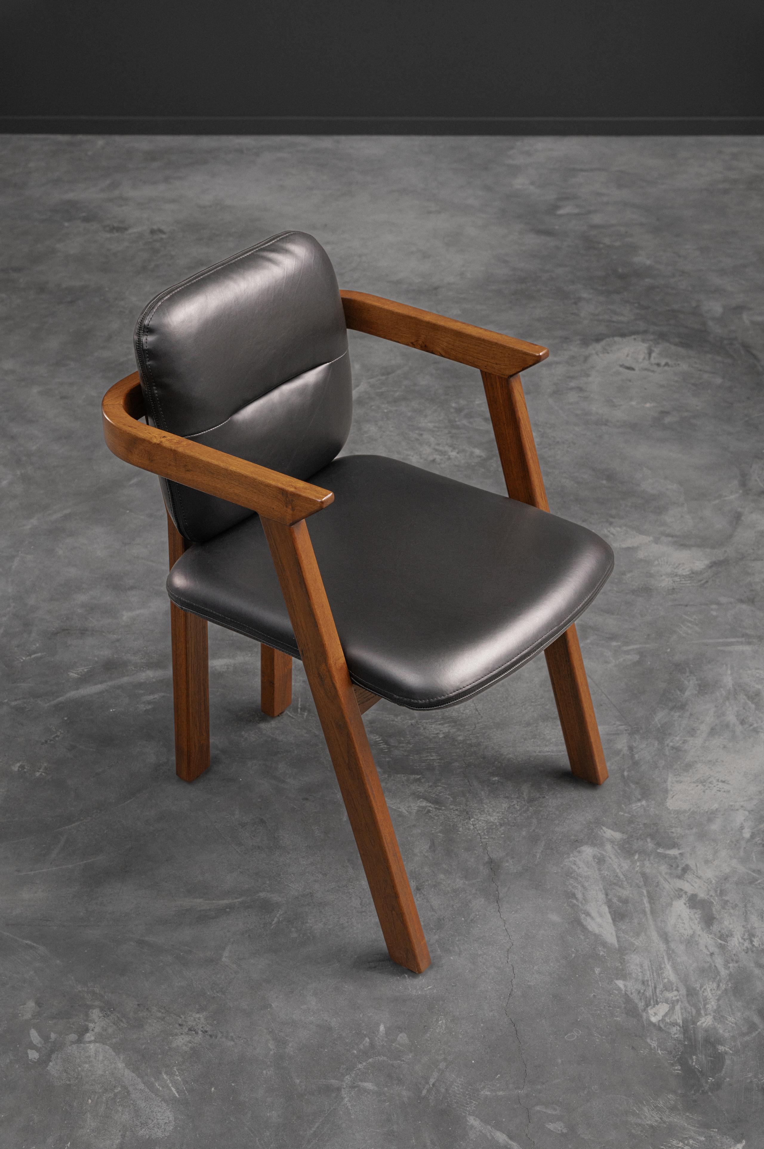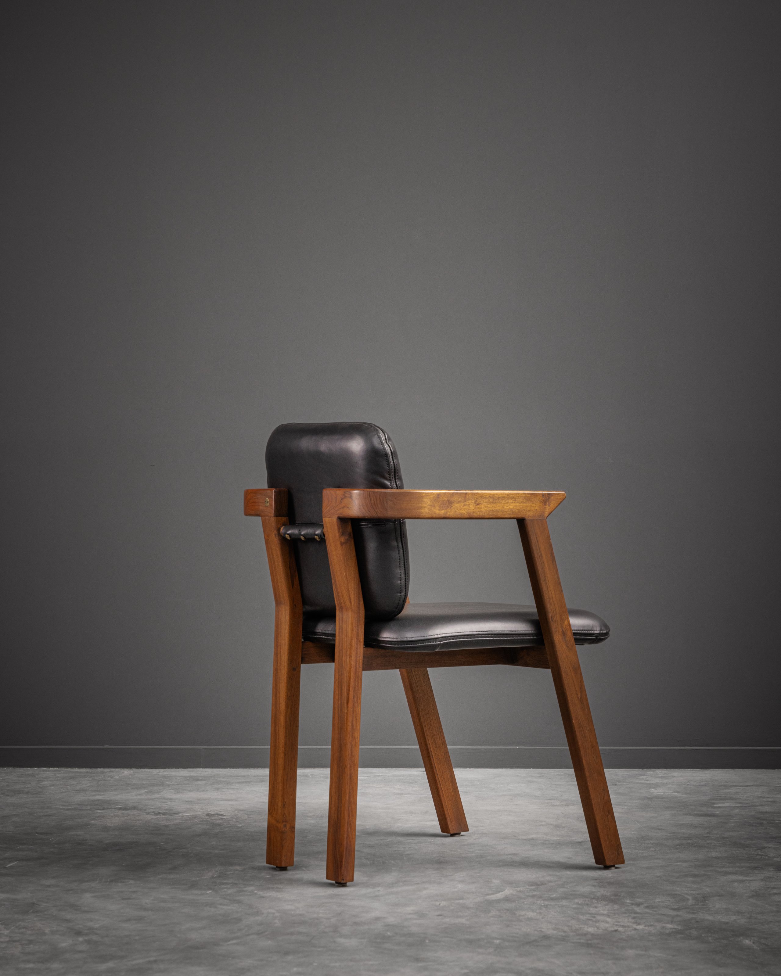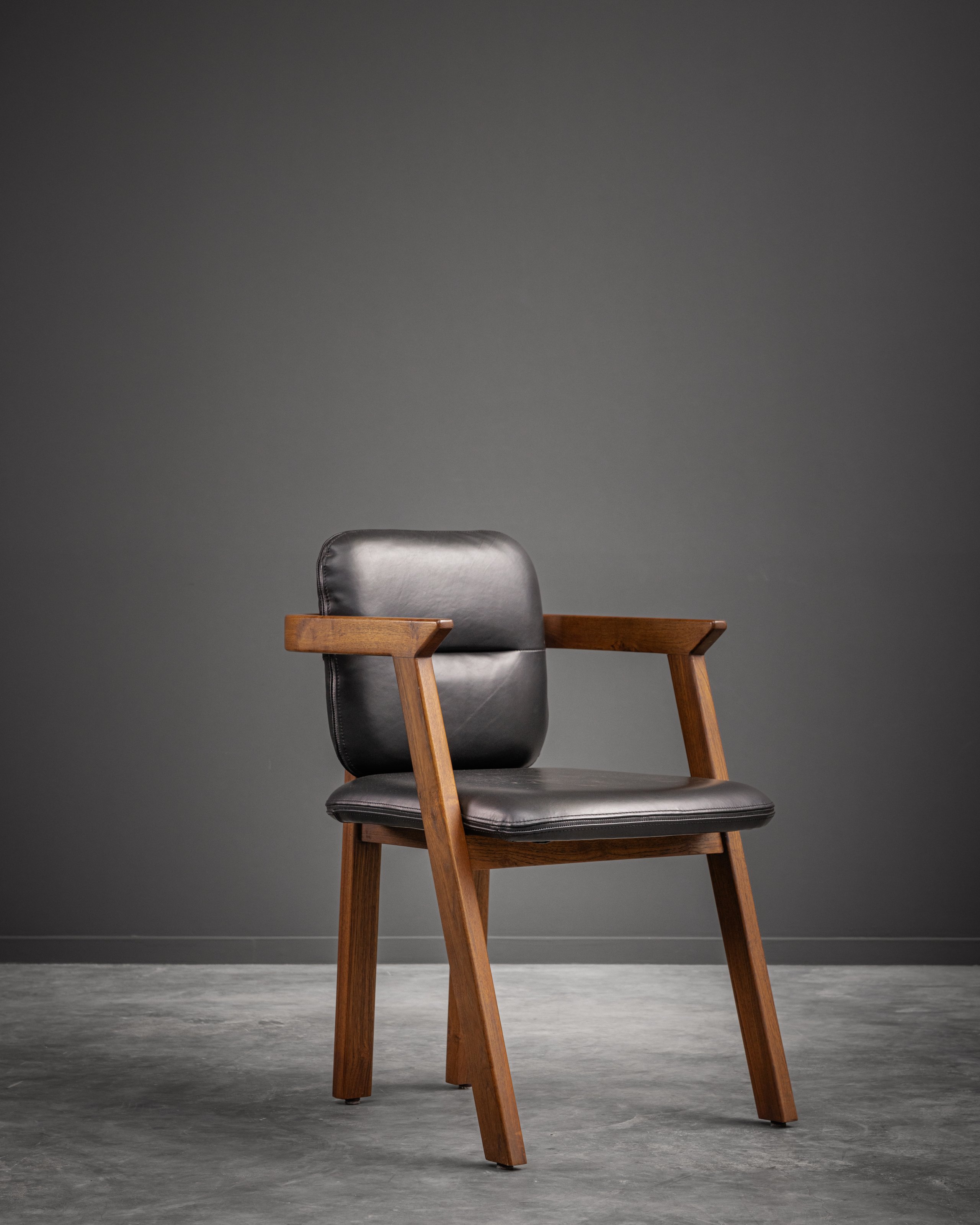 This elegant chair combines minimalist design with high functionality. Constructed with a solid wood frame, it features angular legs and armrests for a bold, geometric look. The backrest and seat are upholstered in sleek fabric/leather/leatherette providing a luxurious feel and easy maintenance. Ergonomically designed, the padded seat and backrest ensure comfort during extended use. Perfect as a dining chair, office chair, or accent piece, this chair seamlessly blends classic craftsmanship with modern aesthetics, making it a versatile addition to any space.