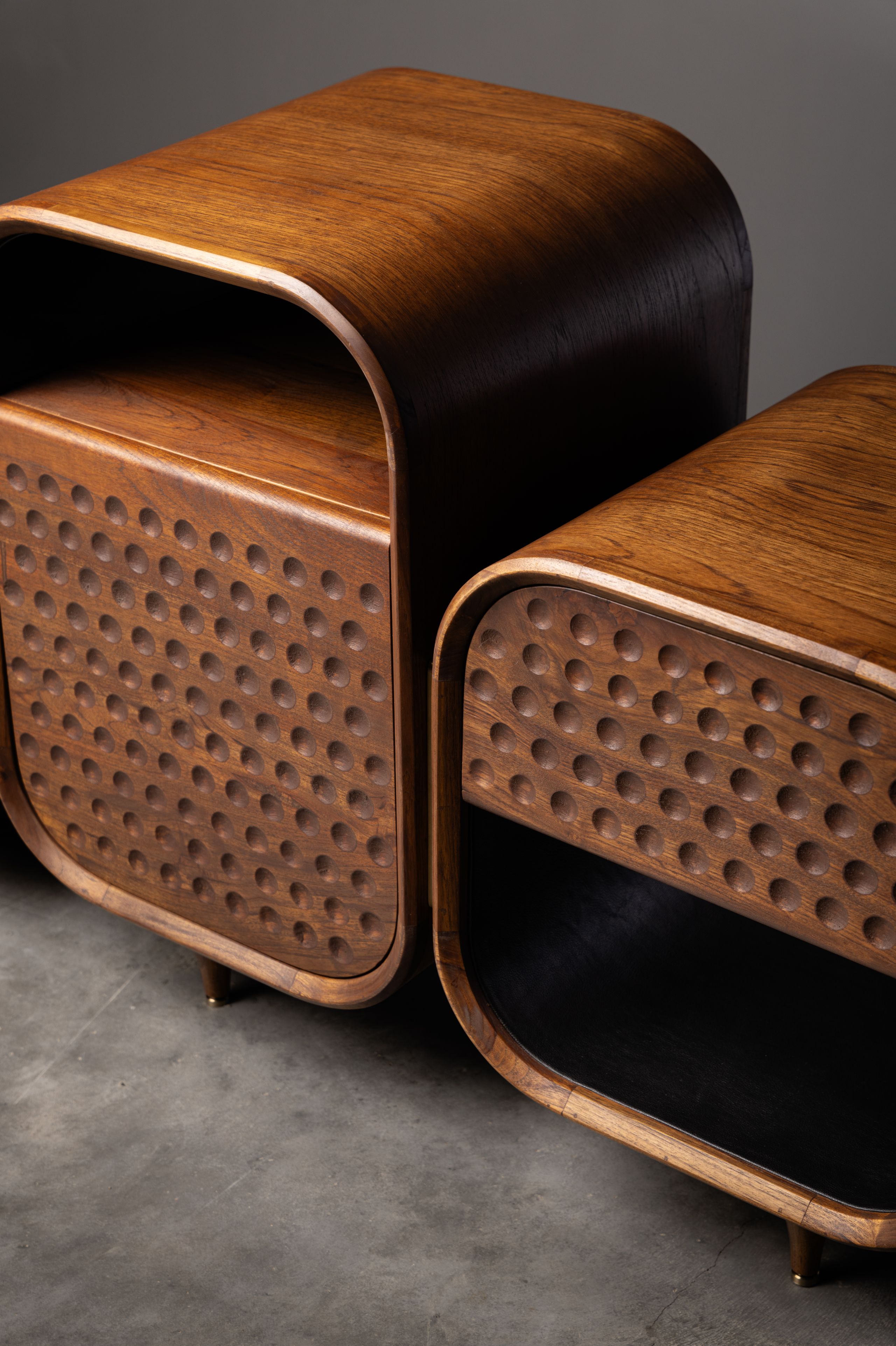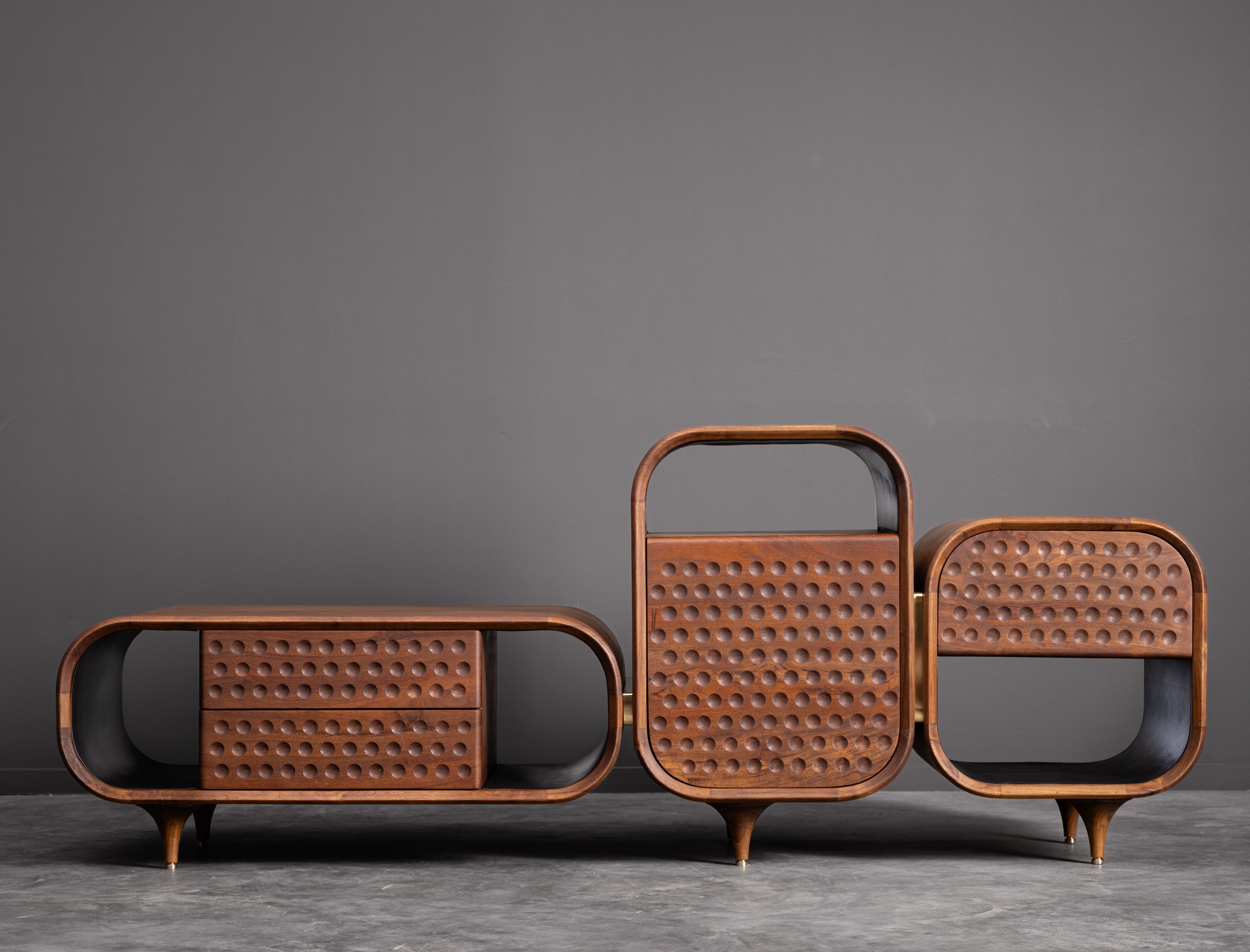 Despite its teak wood simplicity, the boho console thrives in spaces of transition. The edges of the boho are angled to draw your attention to the tapestry of various textures that form its front face, making it suitable to go under a television set. While the piece flaunts its front face, the side faces are a different wood finish to highlight the embedded brass dragonflies. The whole affair rests on four angled teak wood legs that gracefully fulfill the role of supporting all your essential media storage.