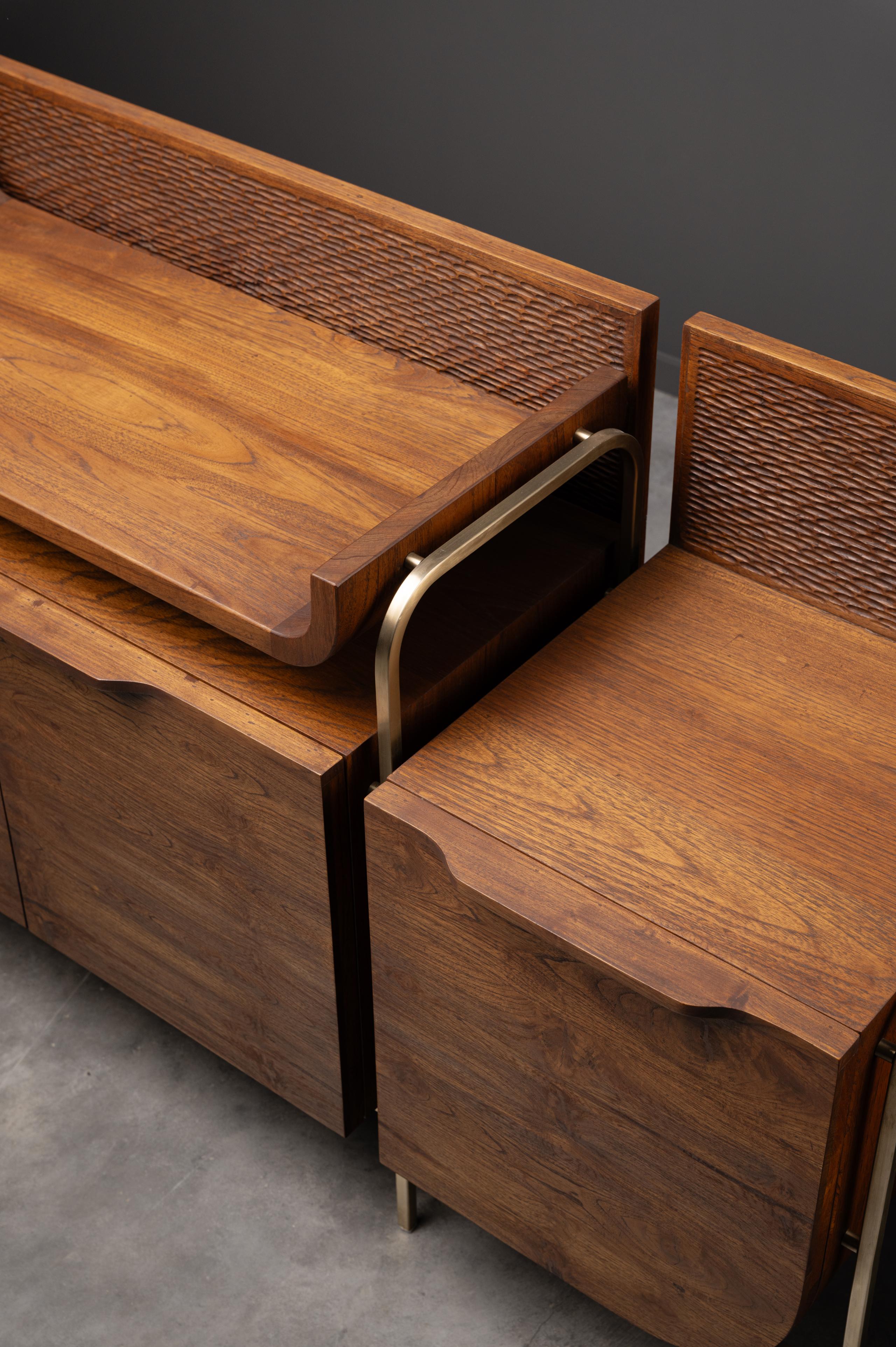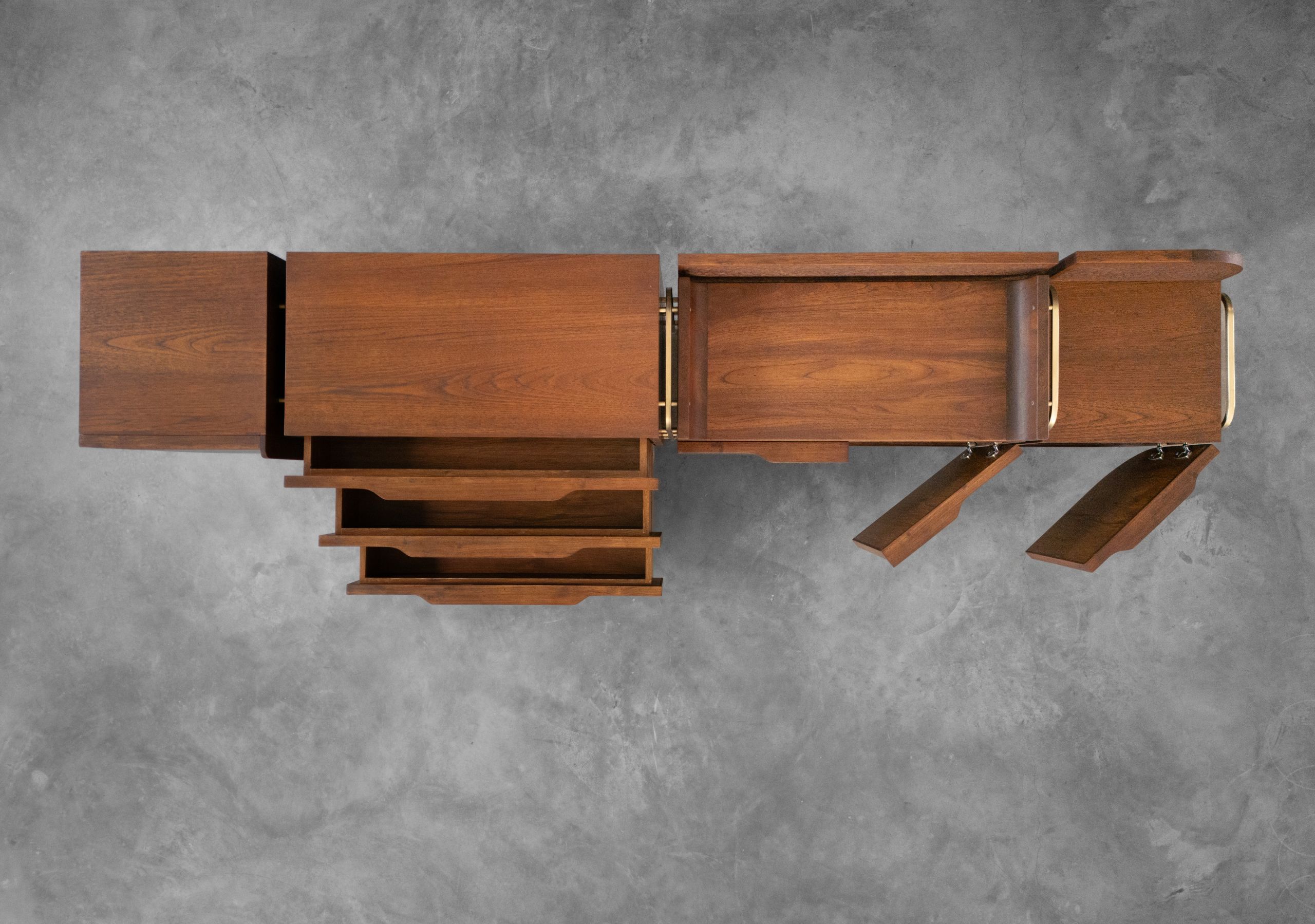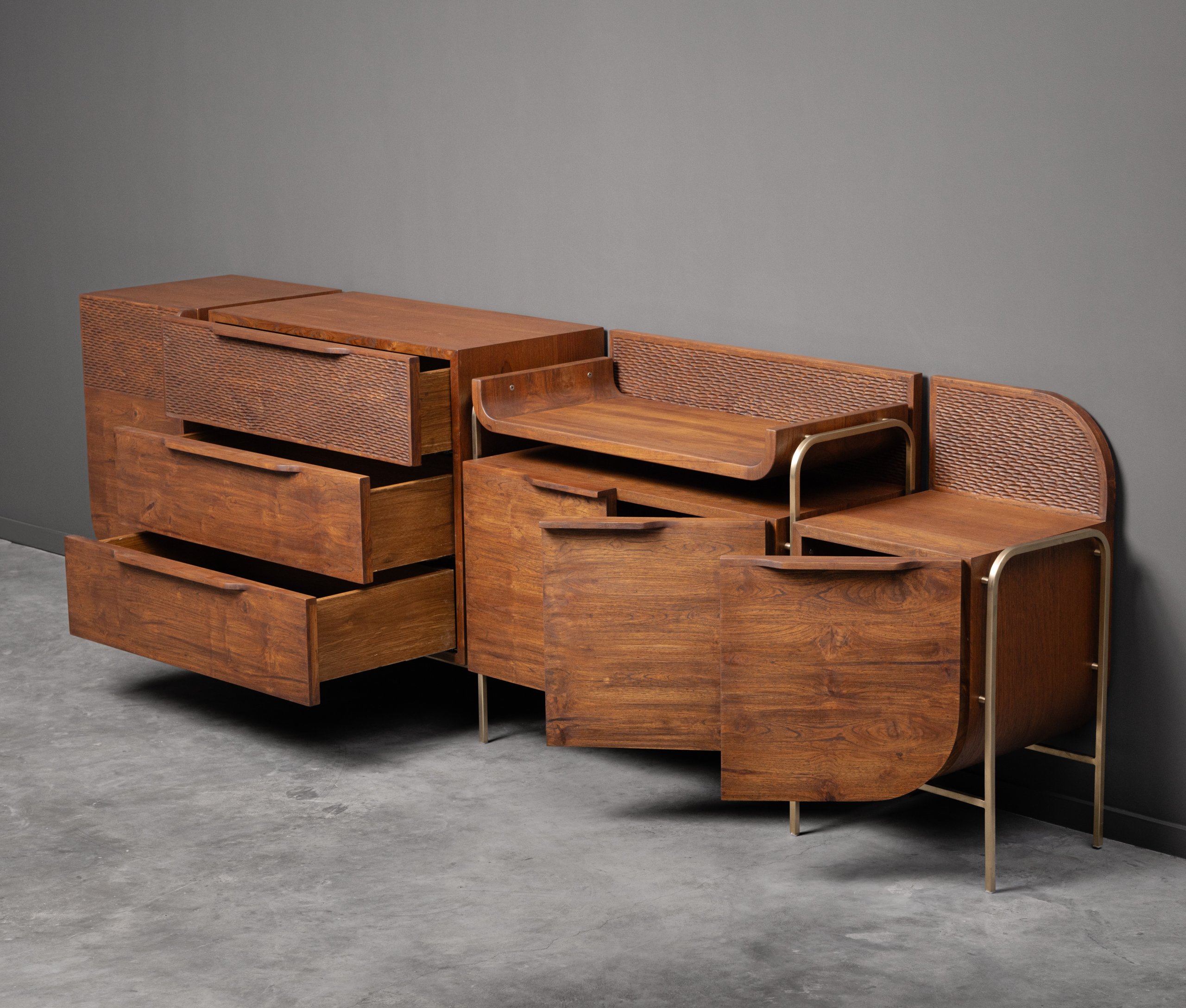Despite its teak wood simplicity, the boho console thrives in spaces of transition. The edges of the boho are angled to draw your attention to the tapestry of various textures that form its front face, making it suitable to go under a television set. While the piece flaunts its front face, the side faces are a different wood finish to highlight the embedded brass dragonflies. The whole affair rests on four angled teak wood legs that gracefully fulfill the role of supporting all your essential media storage.