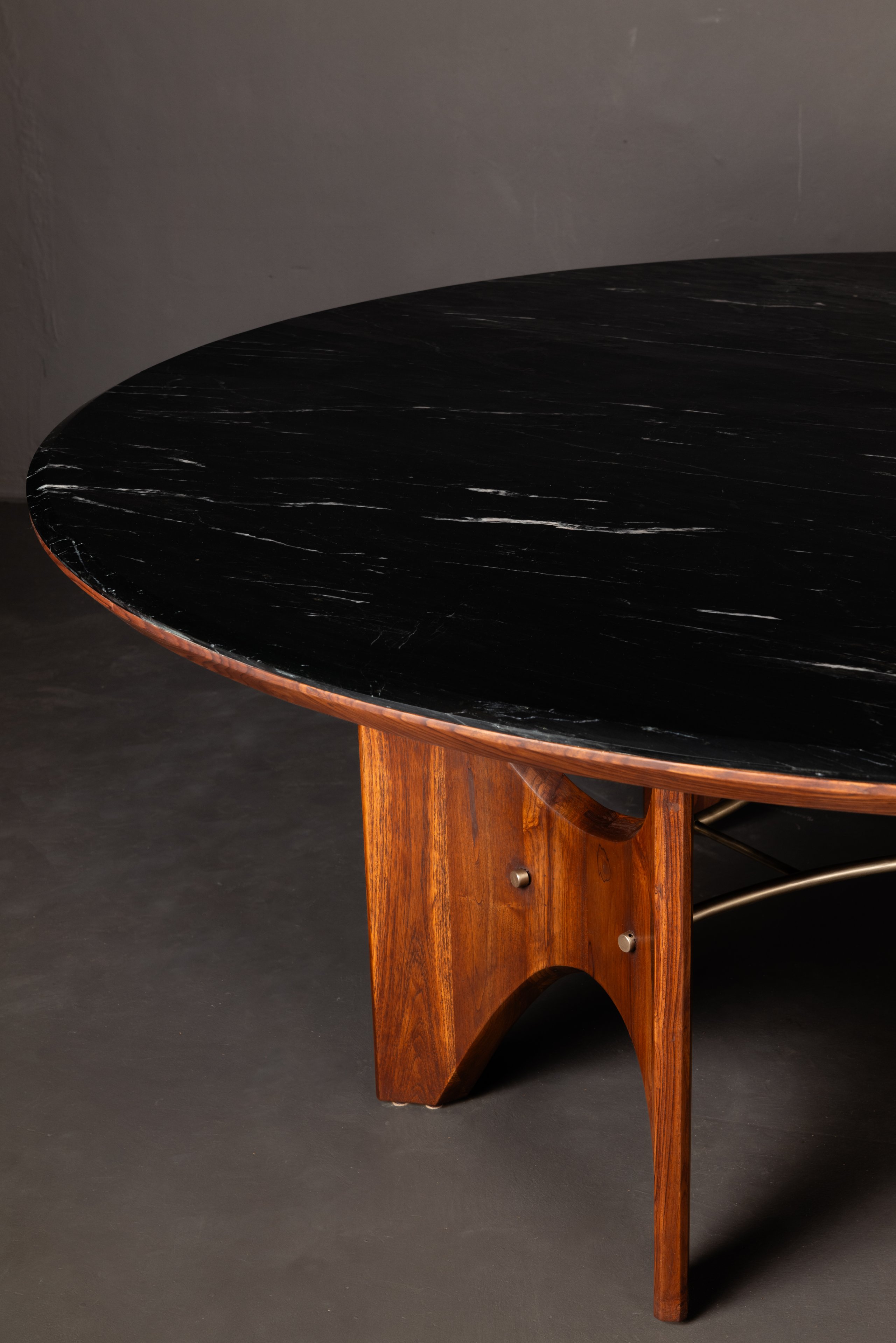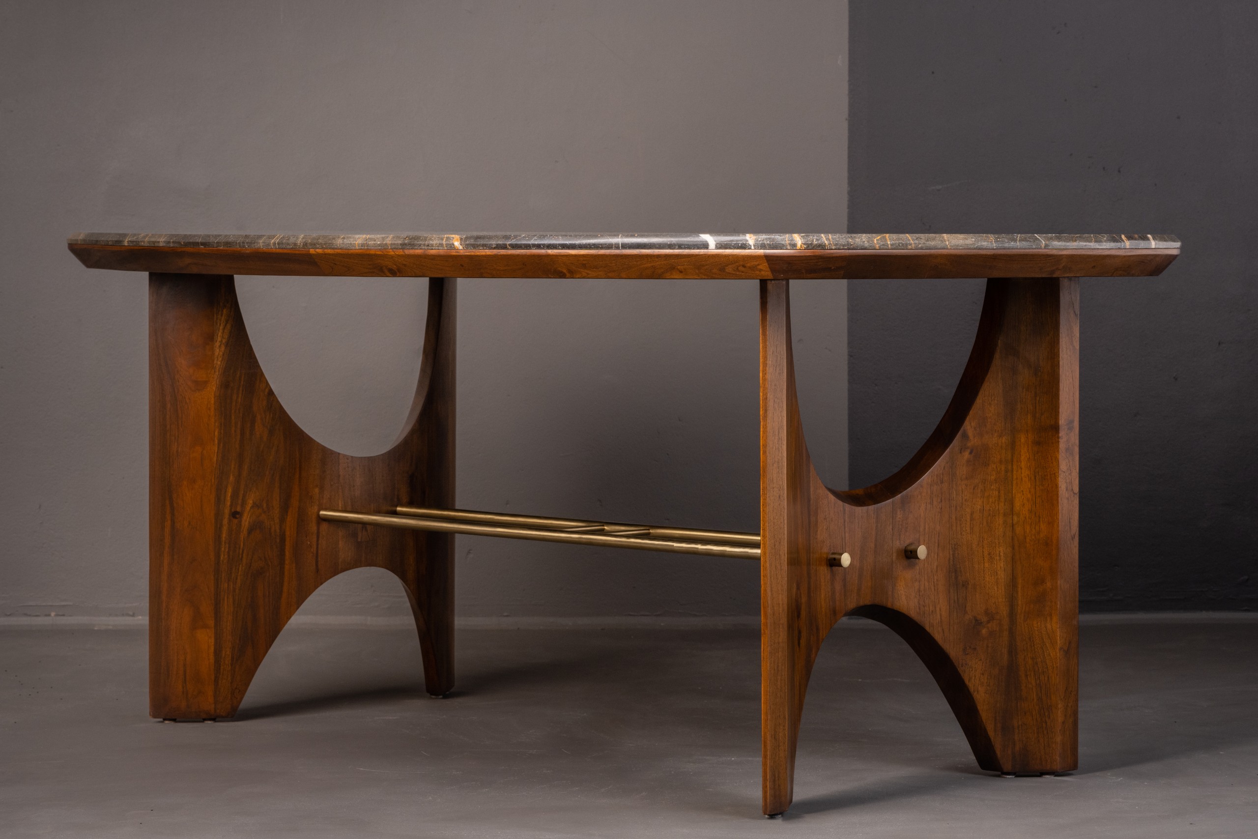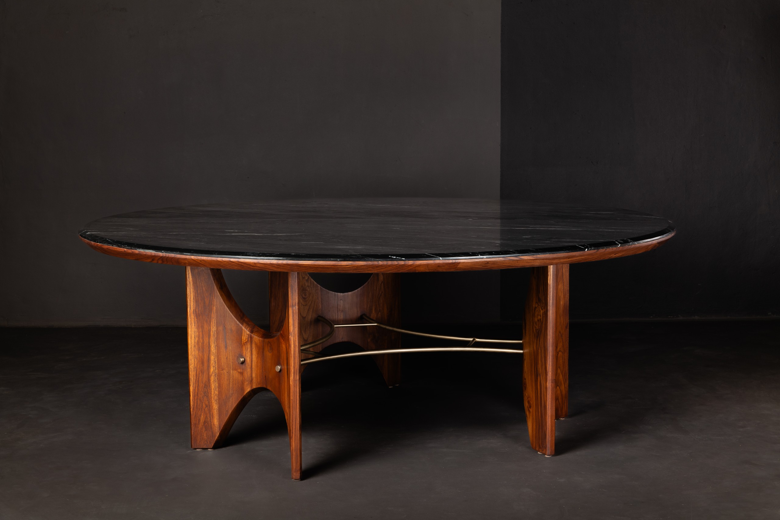 This innovative dining table is crafted by bending teak wood like paper, creating legs that are both delicate and sturdy with beveled edges for a grounded look. A steel frame finished with brass subtly joins the legs, while the Italian marble top adds elegance with its striking patterns. Perfectly sized for a cozy lounge, it works equally well for serving tea, casual gatherings, or even floor seating.