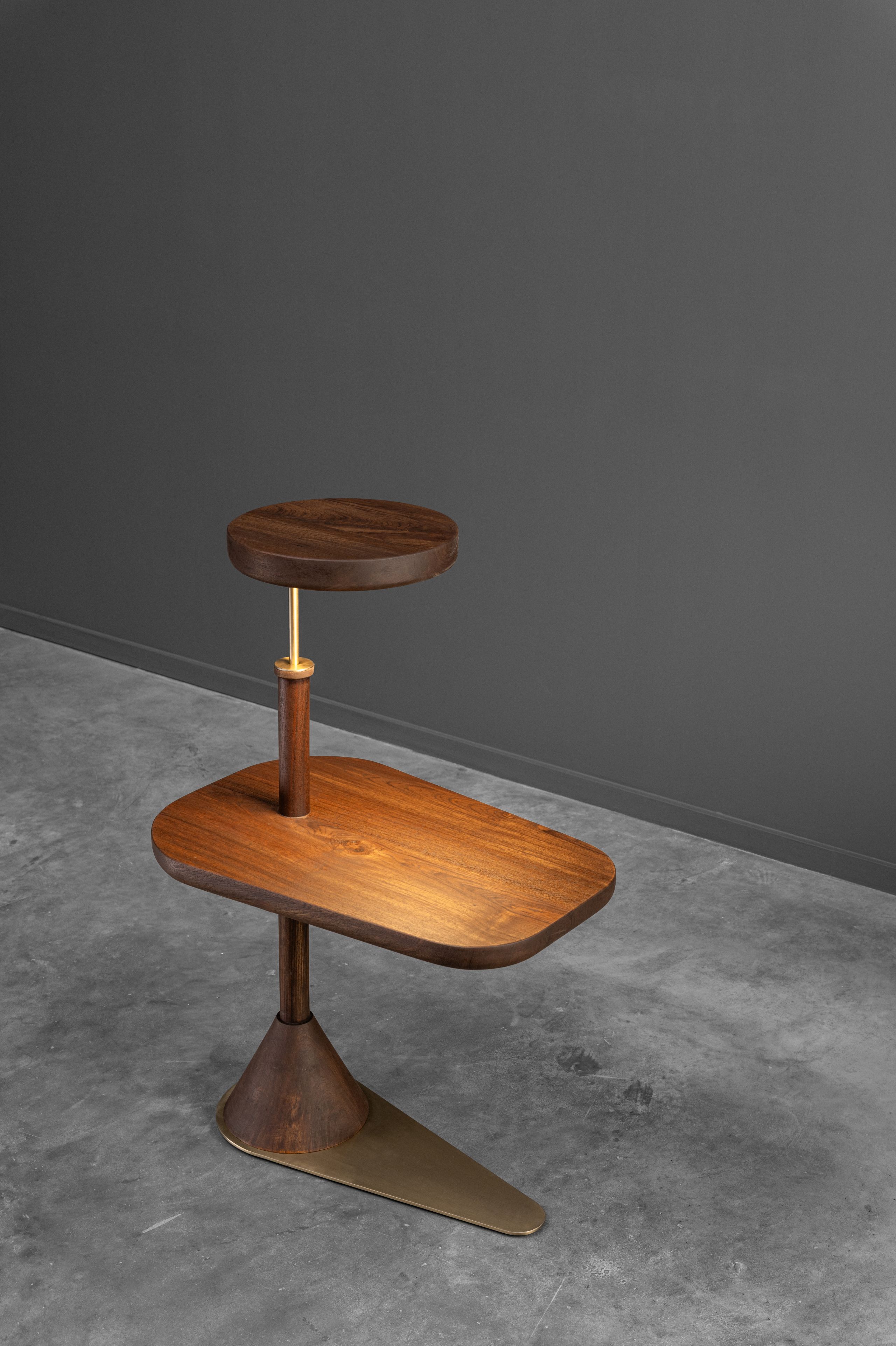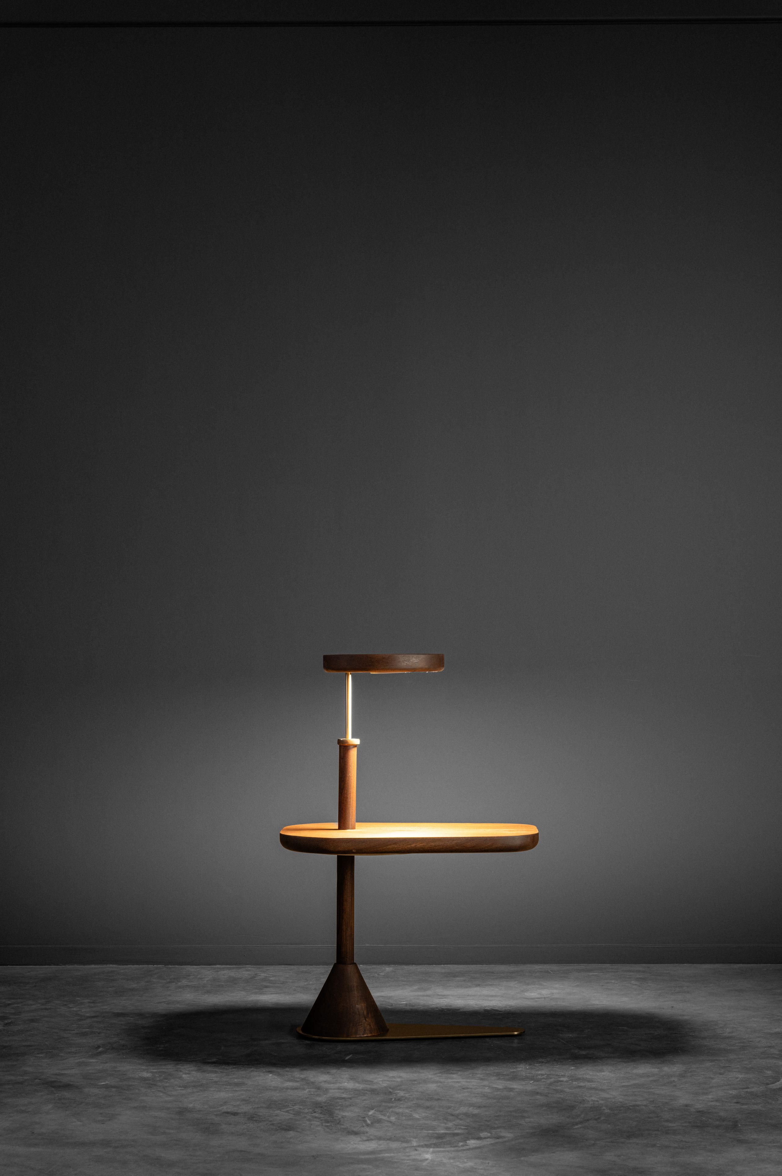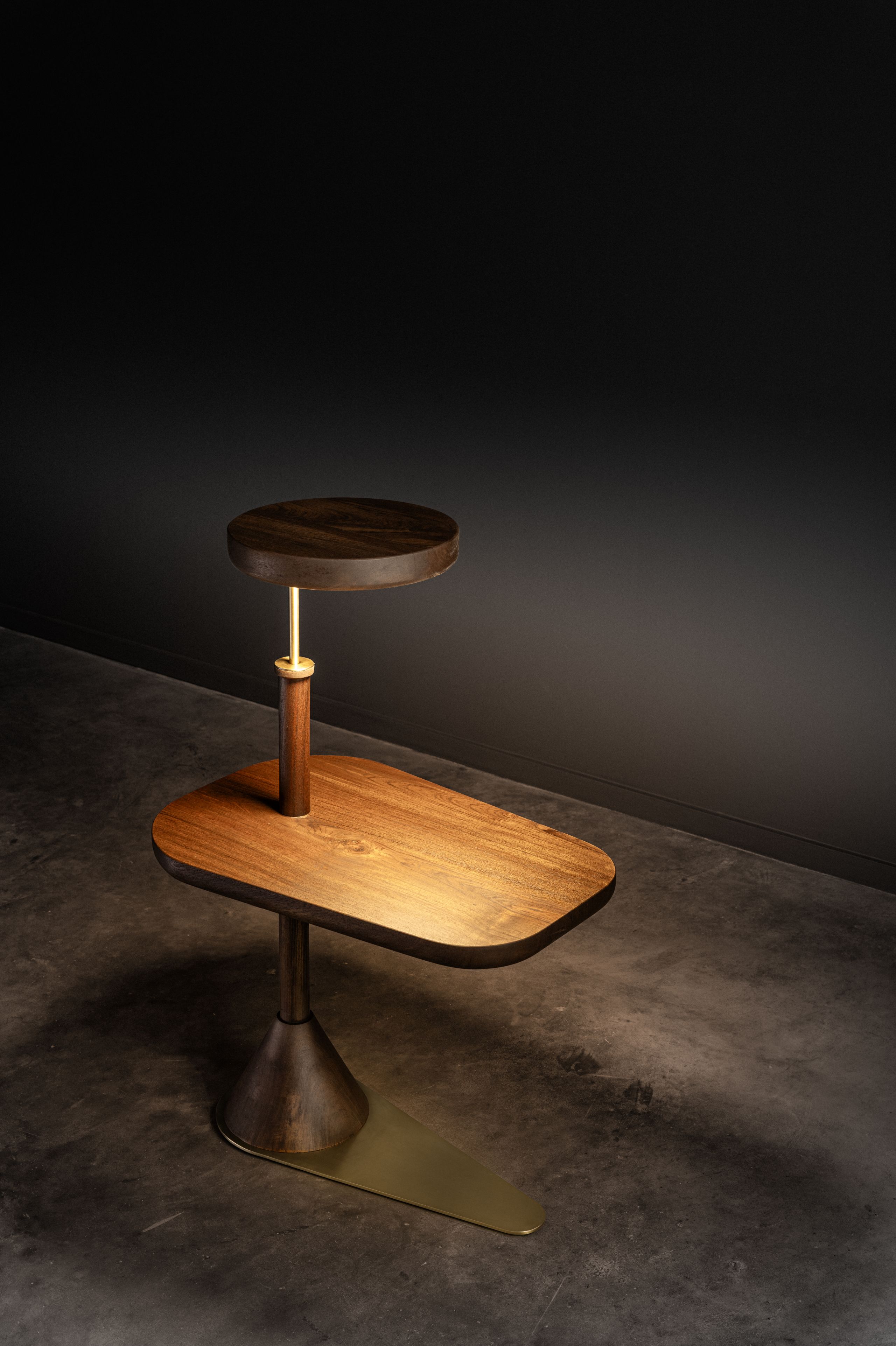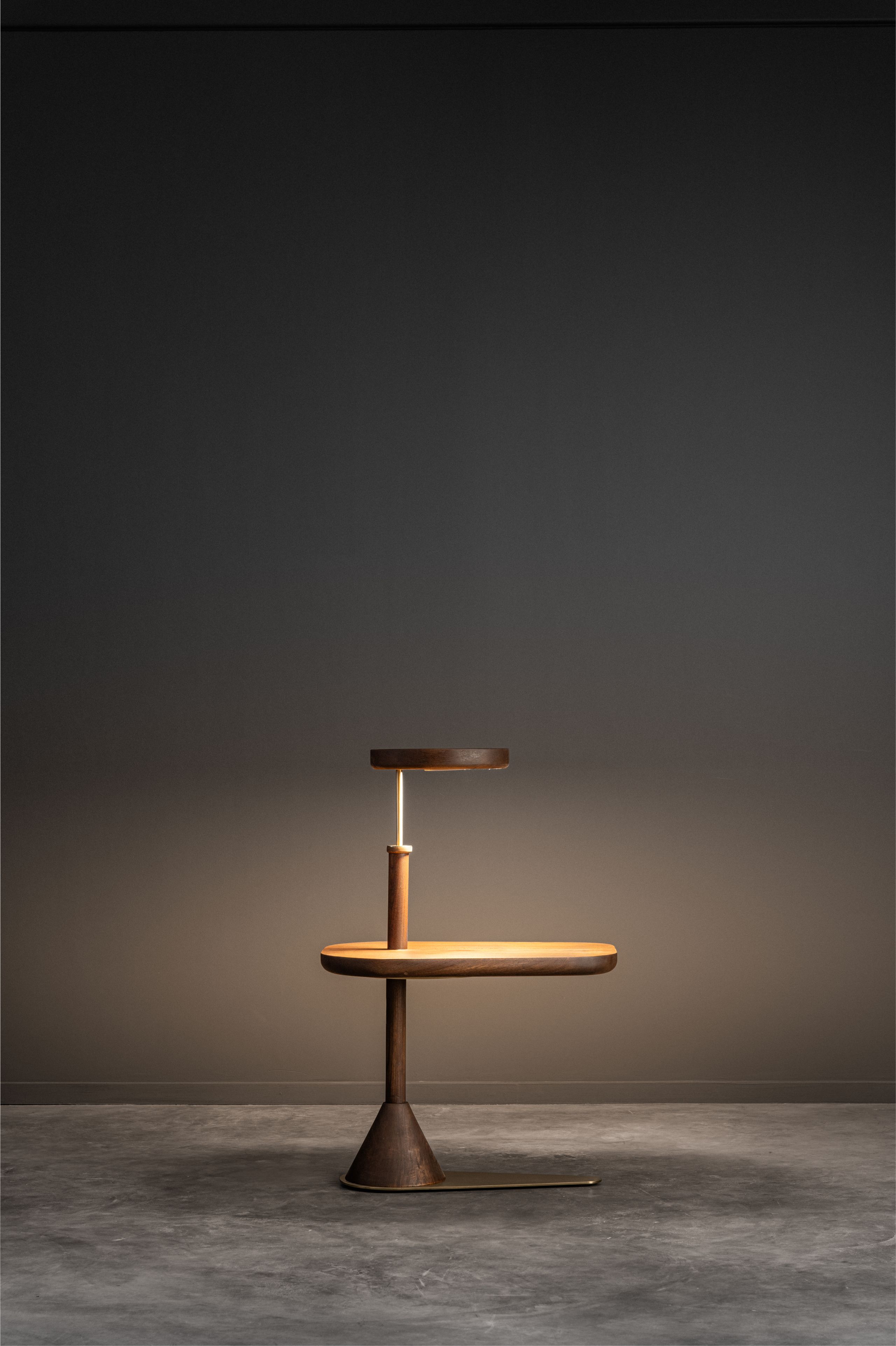 Playful in form yet poised in presence, Brio is a celebration of balance and craft. Its layered composition of circular and oval planes seems to float effortlessly, connected by a slender stem that conceals a soft, golden glow. The light filters gently between the tiers, accentuating the warmth and grain of hand-finished teak. Anchored by a conical base and brass finish base, Brio finds harmony between structure and spontaneity in a piece that feels both functional and sculptural. With its refined geometry and quiet radiance, Brio brings a touch of rhythm and elegance to any space.