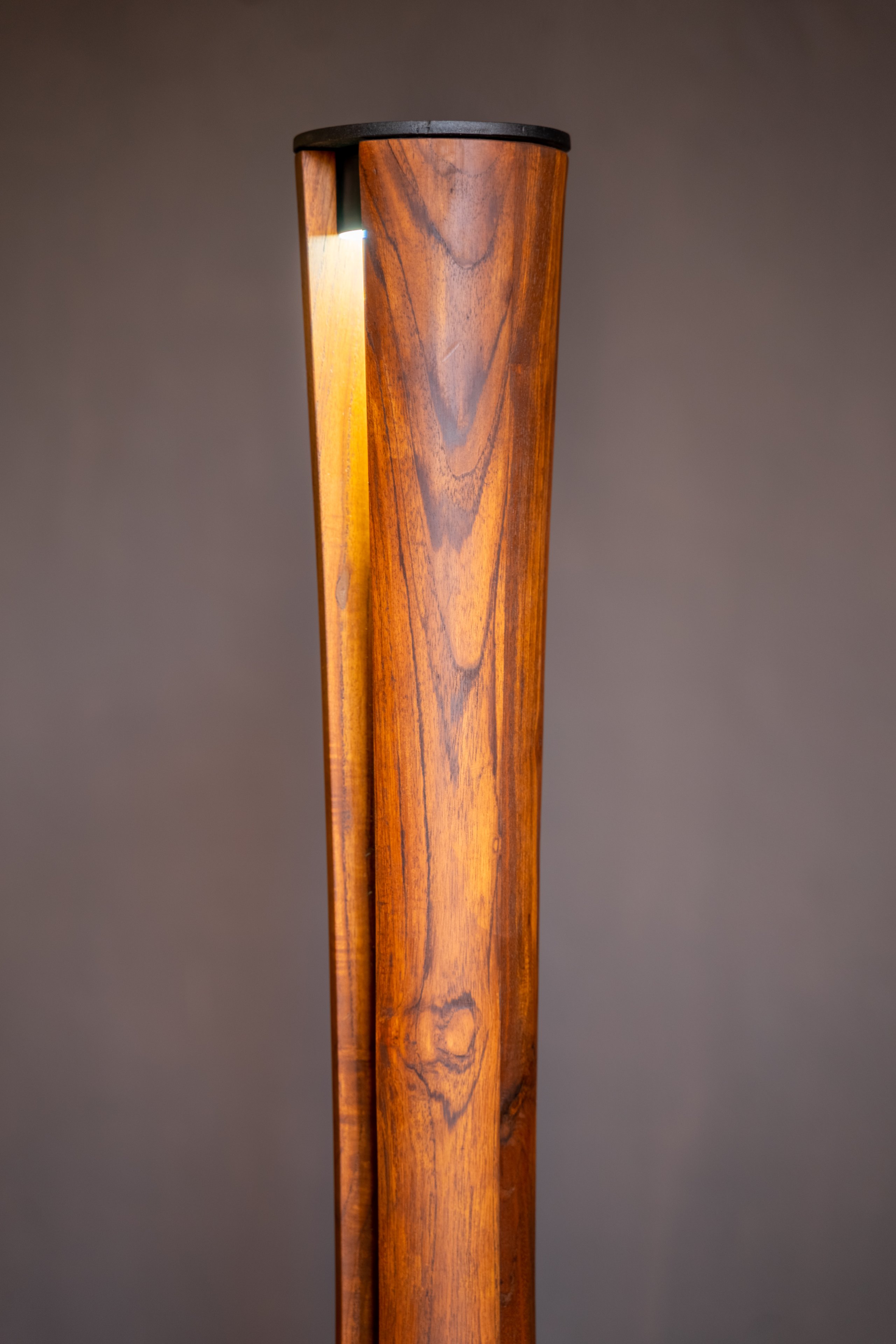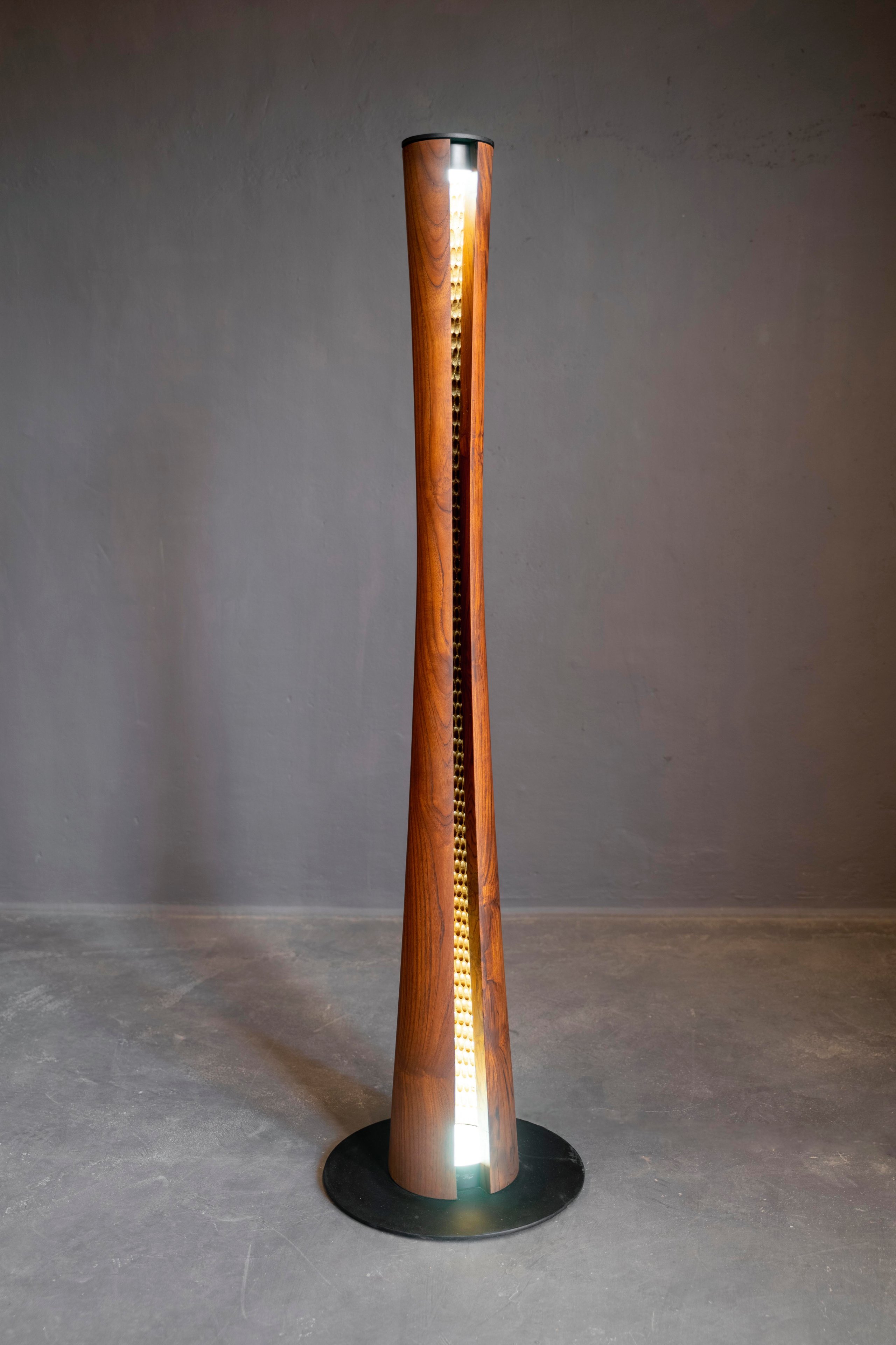 Nothing short of the trophy it resembles, the cove light teases soft openings that reveal the light inside in beautifully controlled amounts. Looking almost like it is zipped open, the insides of the piece reveal hand-carved textures that are softly lit by the light emerging from two base plates. The turned teak wood is finished with monocoat polish on the exterior and the mild steel plates on the top and bottom in black powder coating.