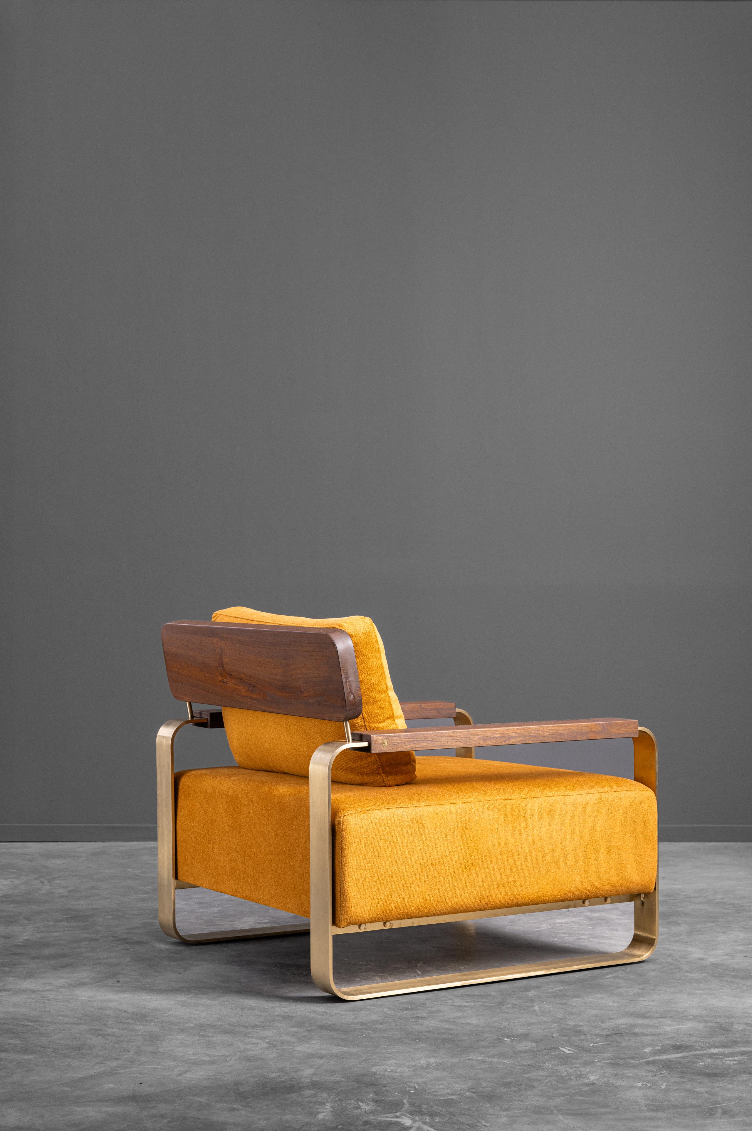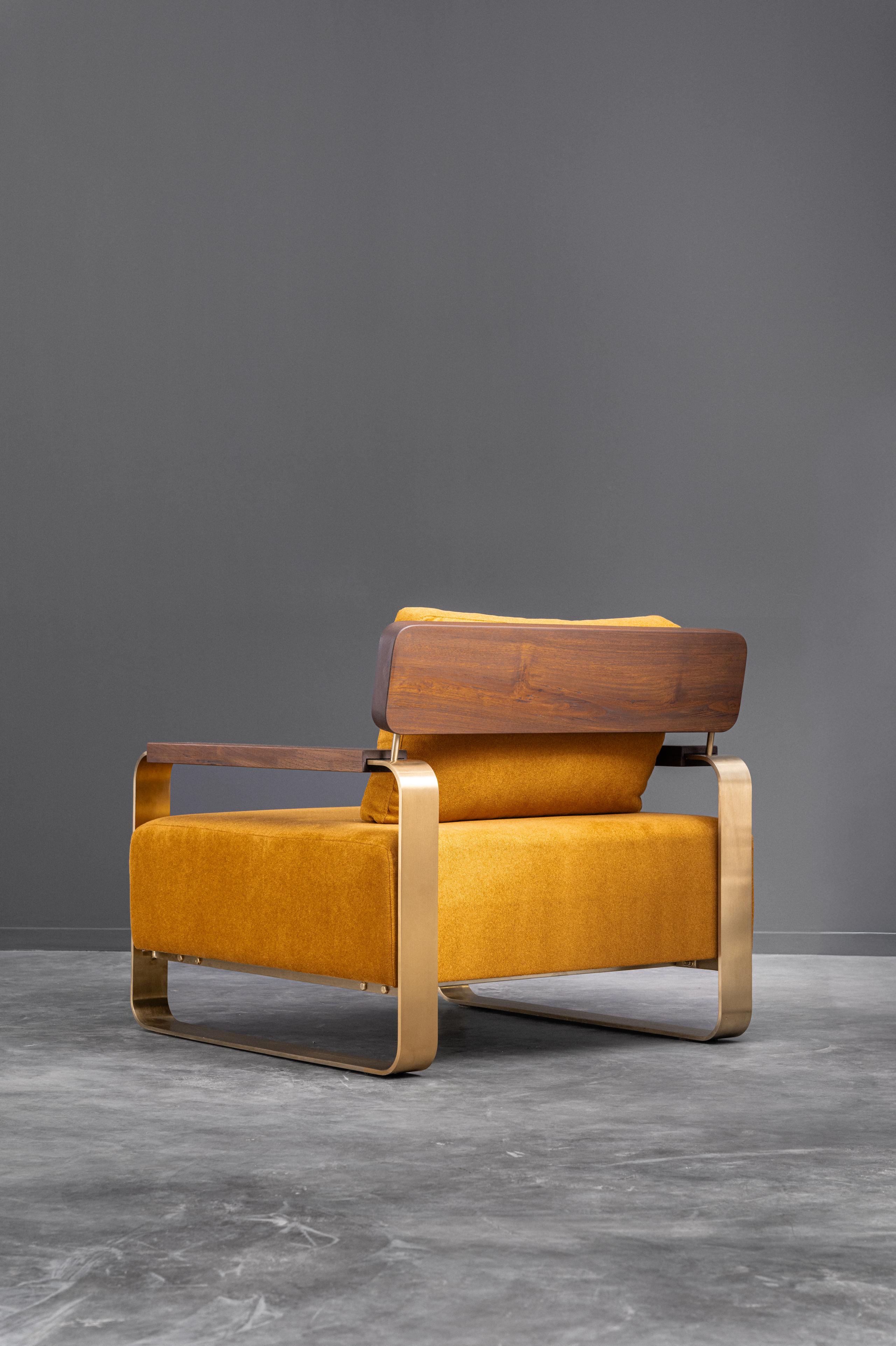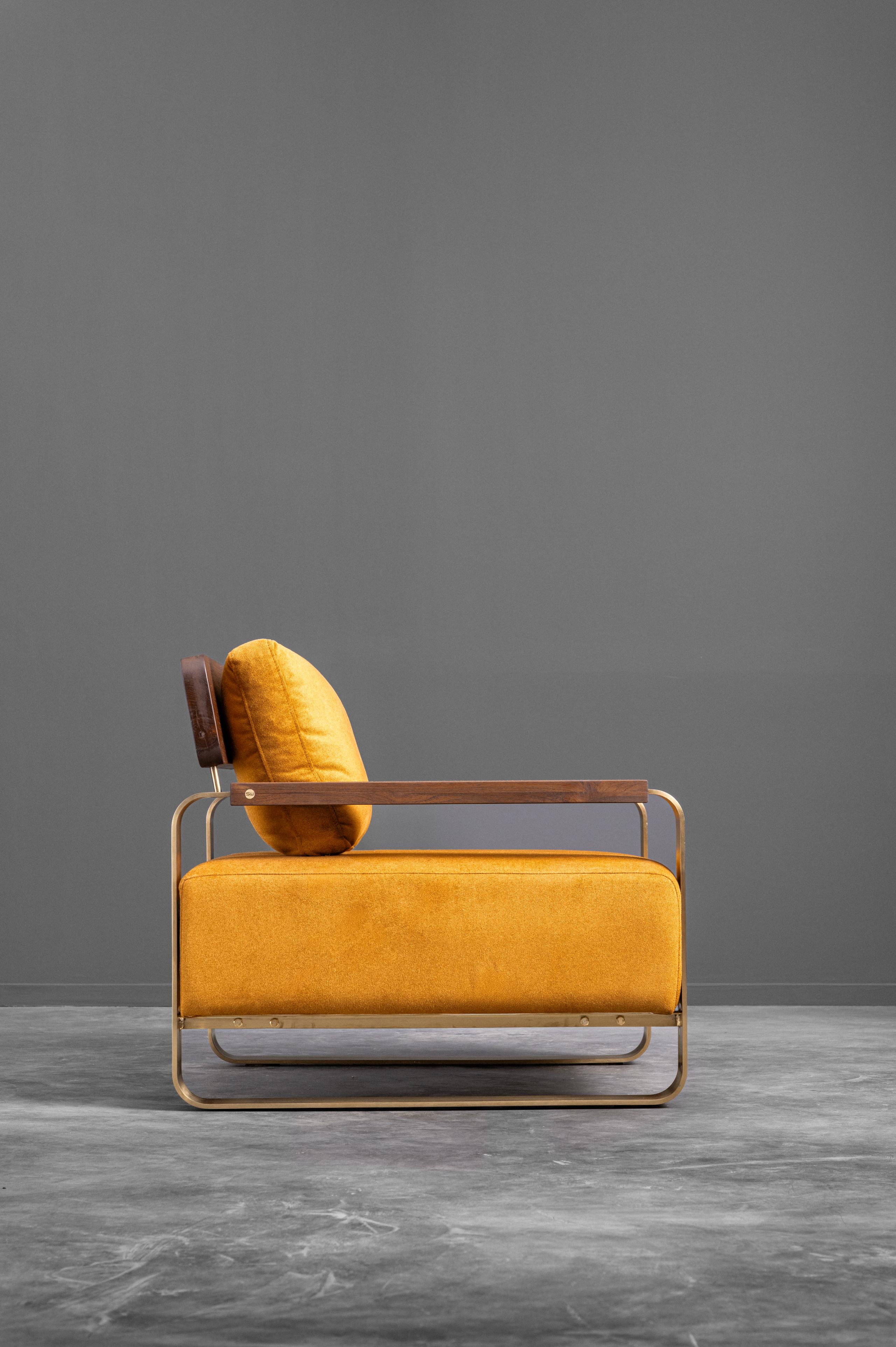 A chair defined by its bold simplicity and striking material interplay. The Confort single seater pairs a richly upholstered seat with sweeping metal legs that loop gracefully to form its base. The curved wooden backrest and slim wooden arms soften the geometry, giving the piece a warm, human touch. Its generous proportions and supportive cushions make it a place to sink in and unwind, while the strong silhouette keeps it visually crisp and modern. Adaptable and expressive, it transitions effortlessly across contemporary and eclectic interiors alike.