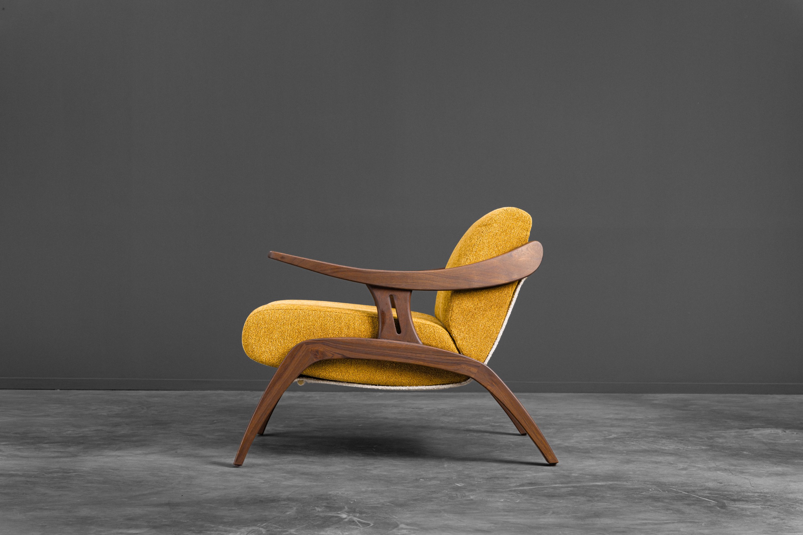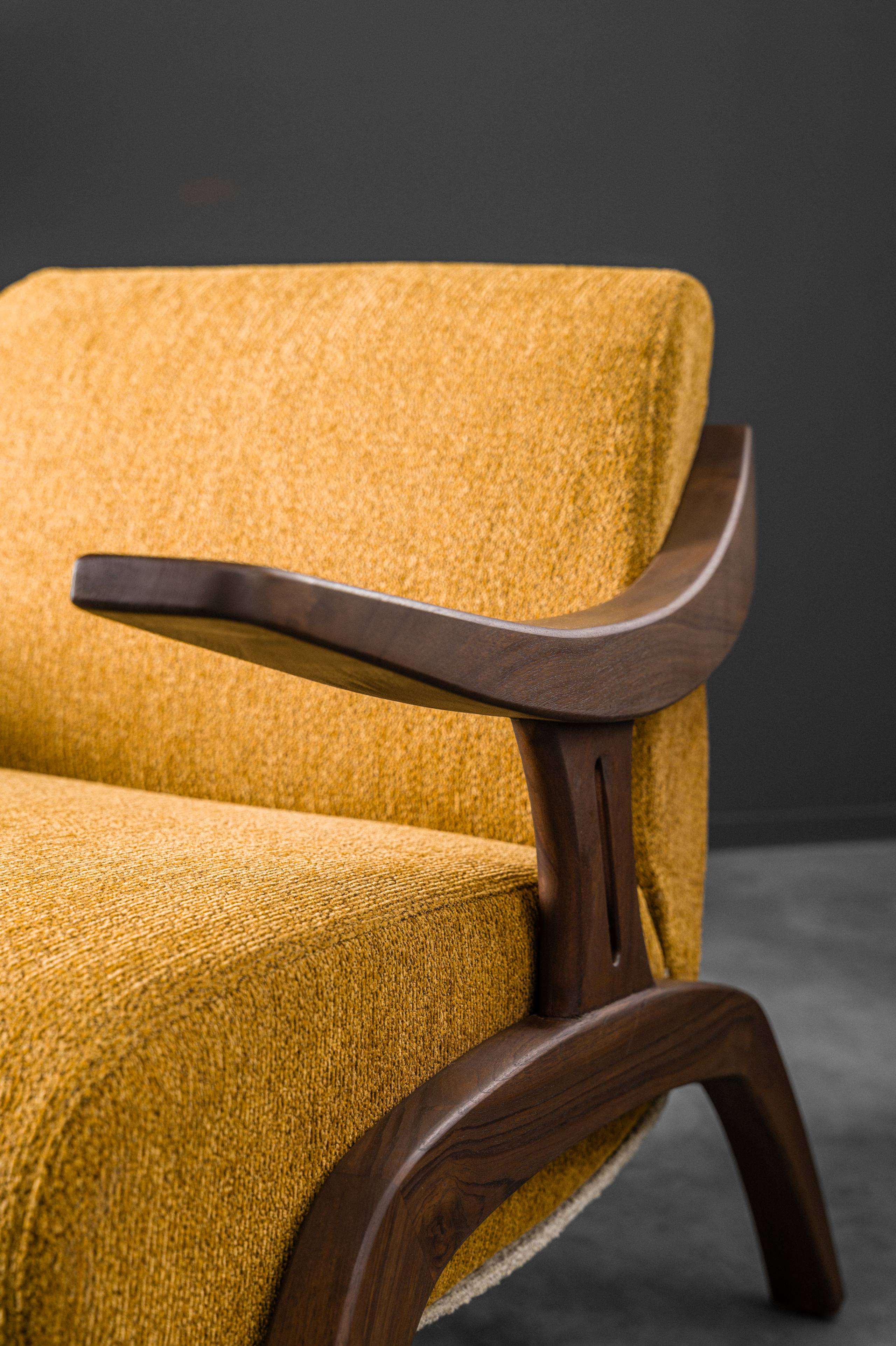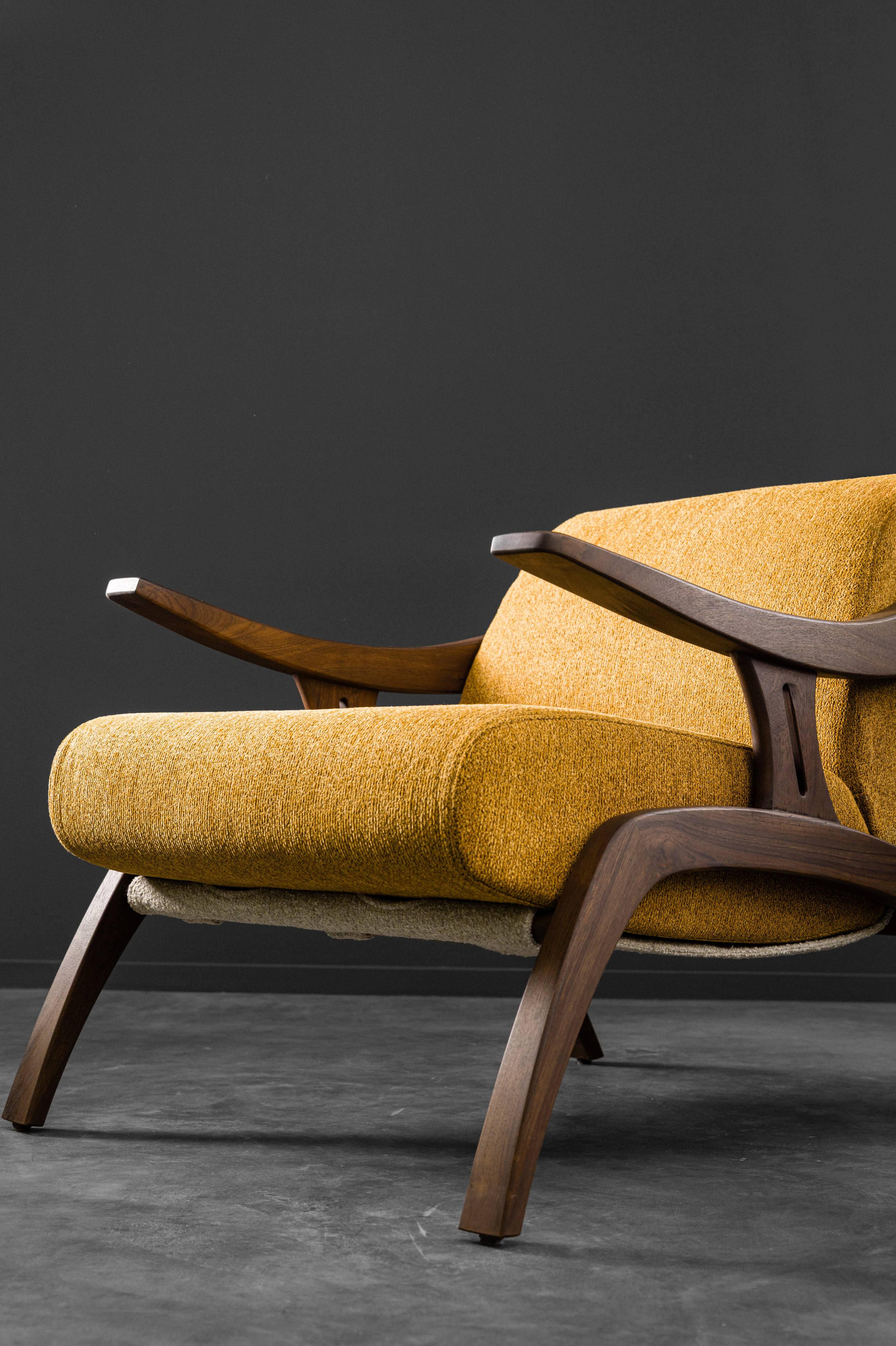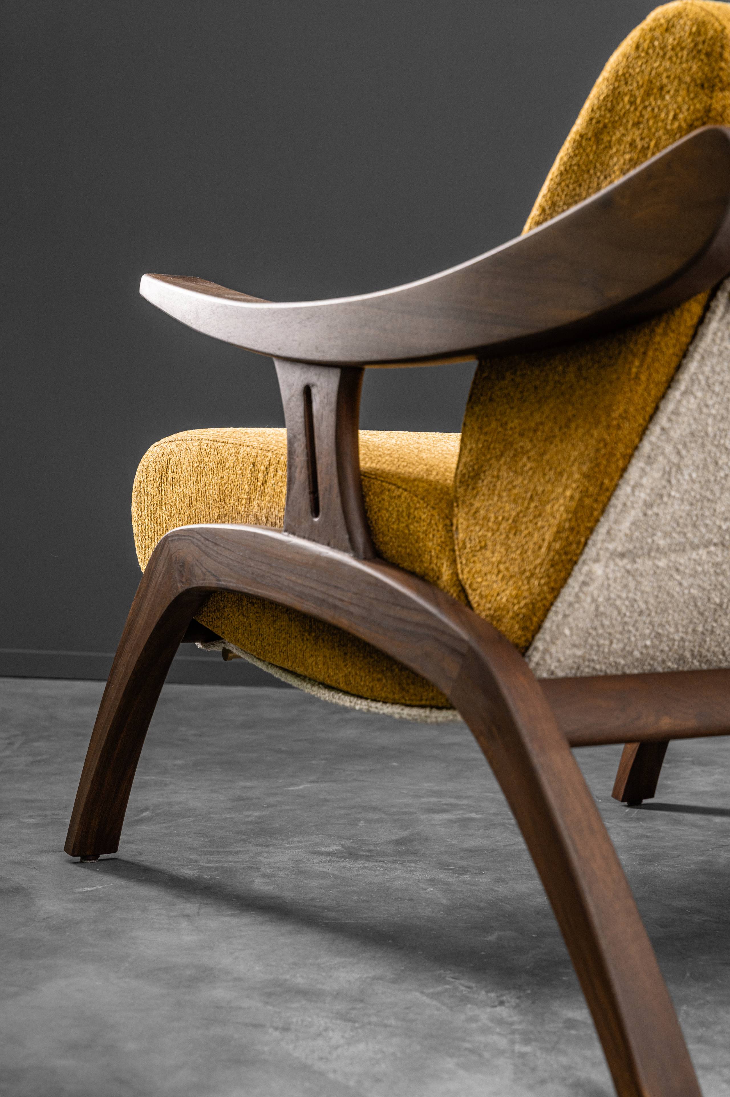 Looking like it has stepped out of a mid-century sketchbook, the May Chair is a statement of quiet confidence. With its solid wooden frame curving effortlessly into the armrests, it carries a sculptural elegance that feels both nostalgic and modern. Designed for comfort without compromise, the MAY Chair stands as both a conversation starter and a timeless companion for refined interiors.