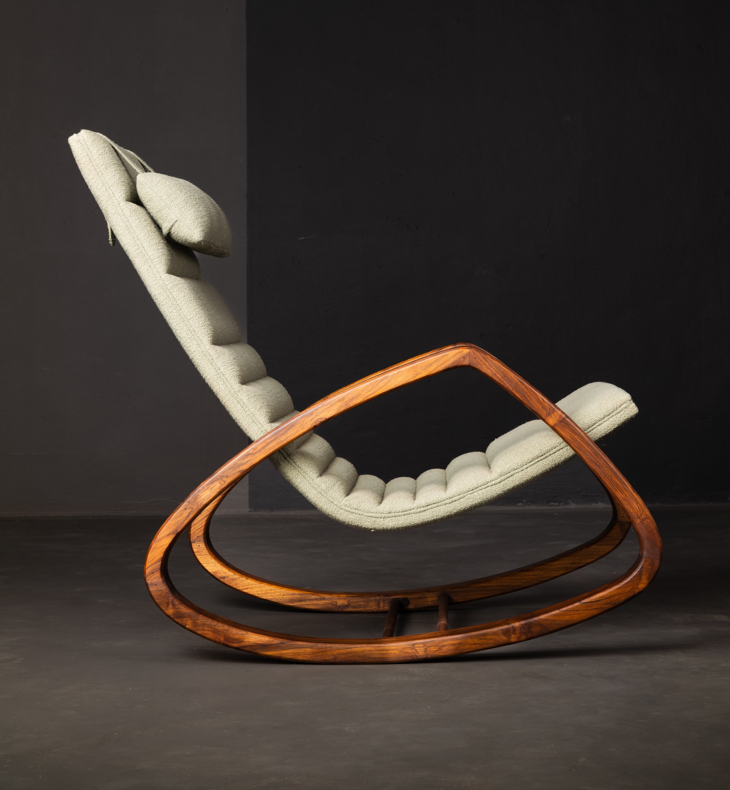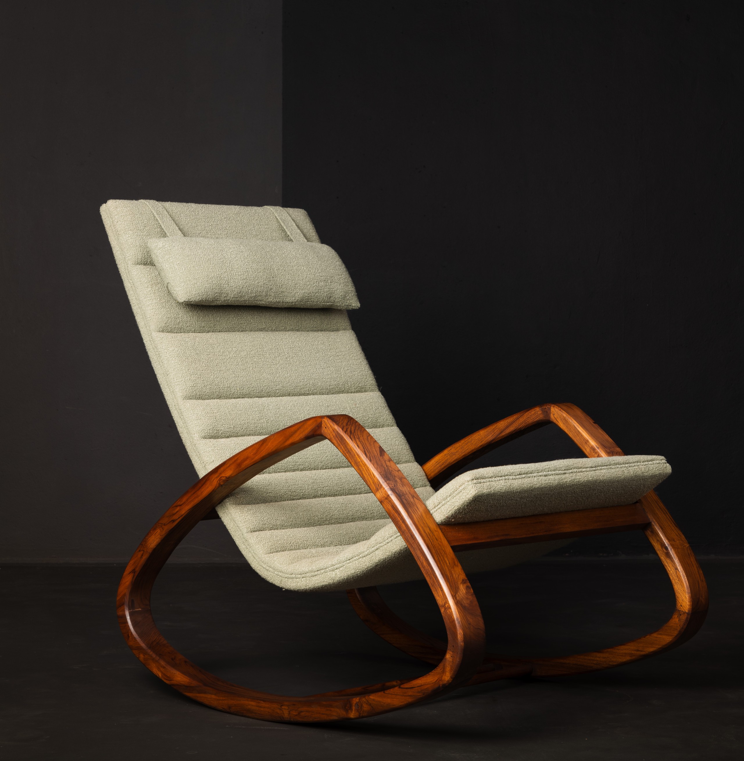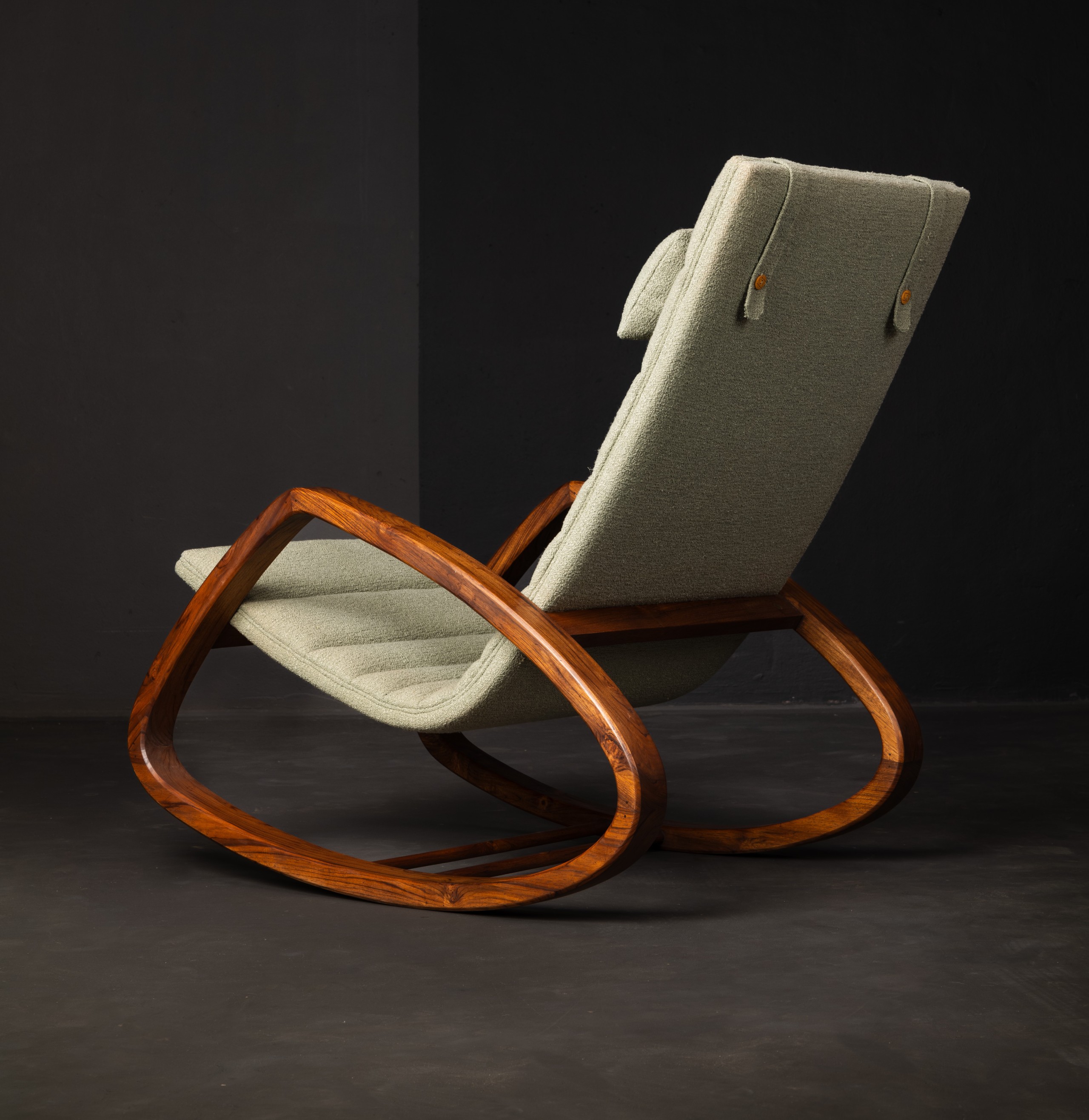 This sleek rocking chair combines contemporary design with ultimate comfort. The soft, neutral fabric and subtle stitching offer a stylish touch, while the curved wooden frame ensures a smooth, relaxing motion. With an ergonomic backrest and cushioned headrest, this chair is perfect for unwinding in any modern living space. Enjoy a blend of elegance and relaxation in your home.