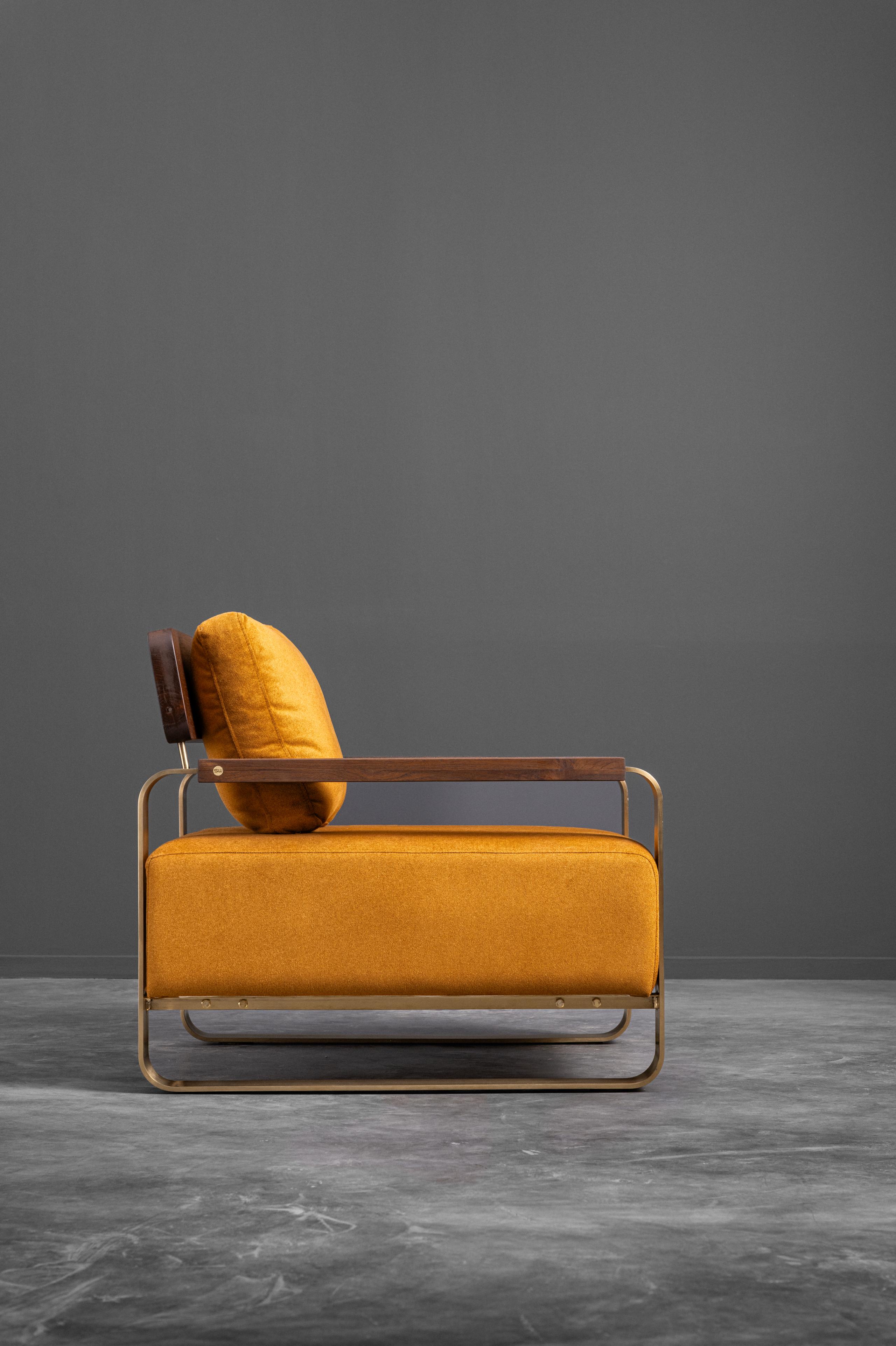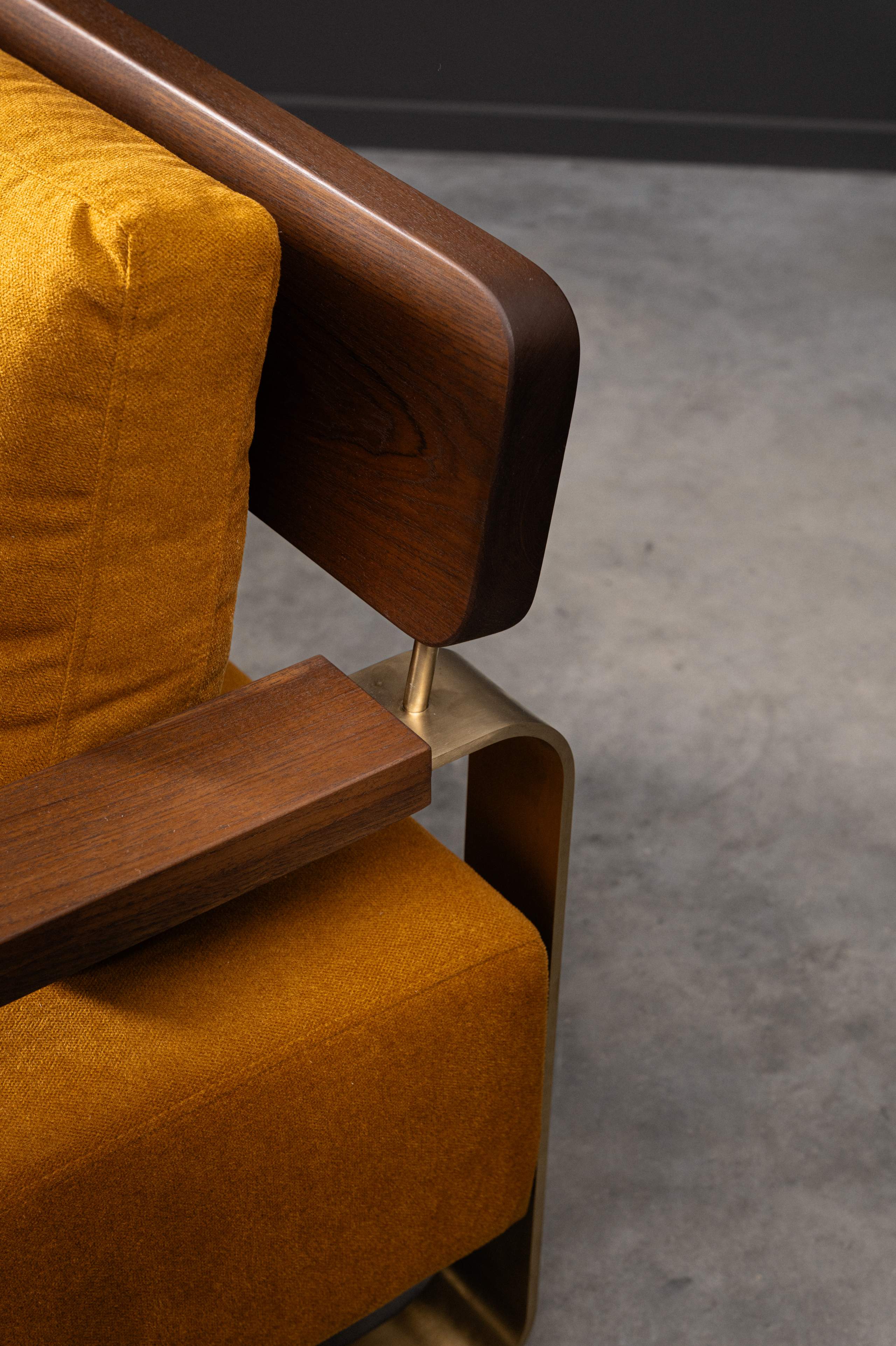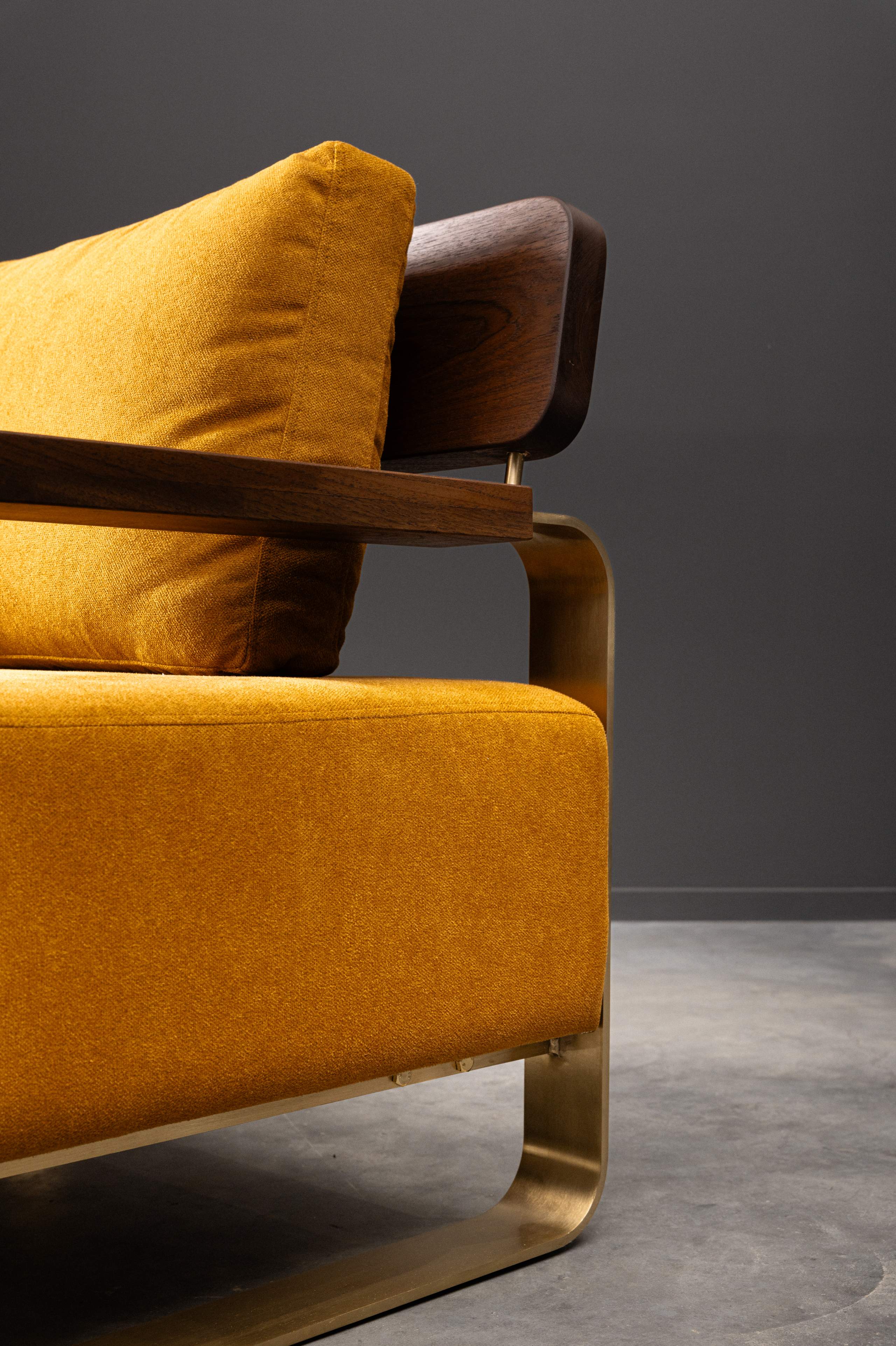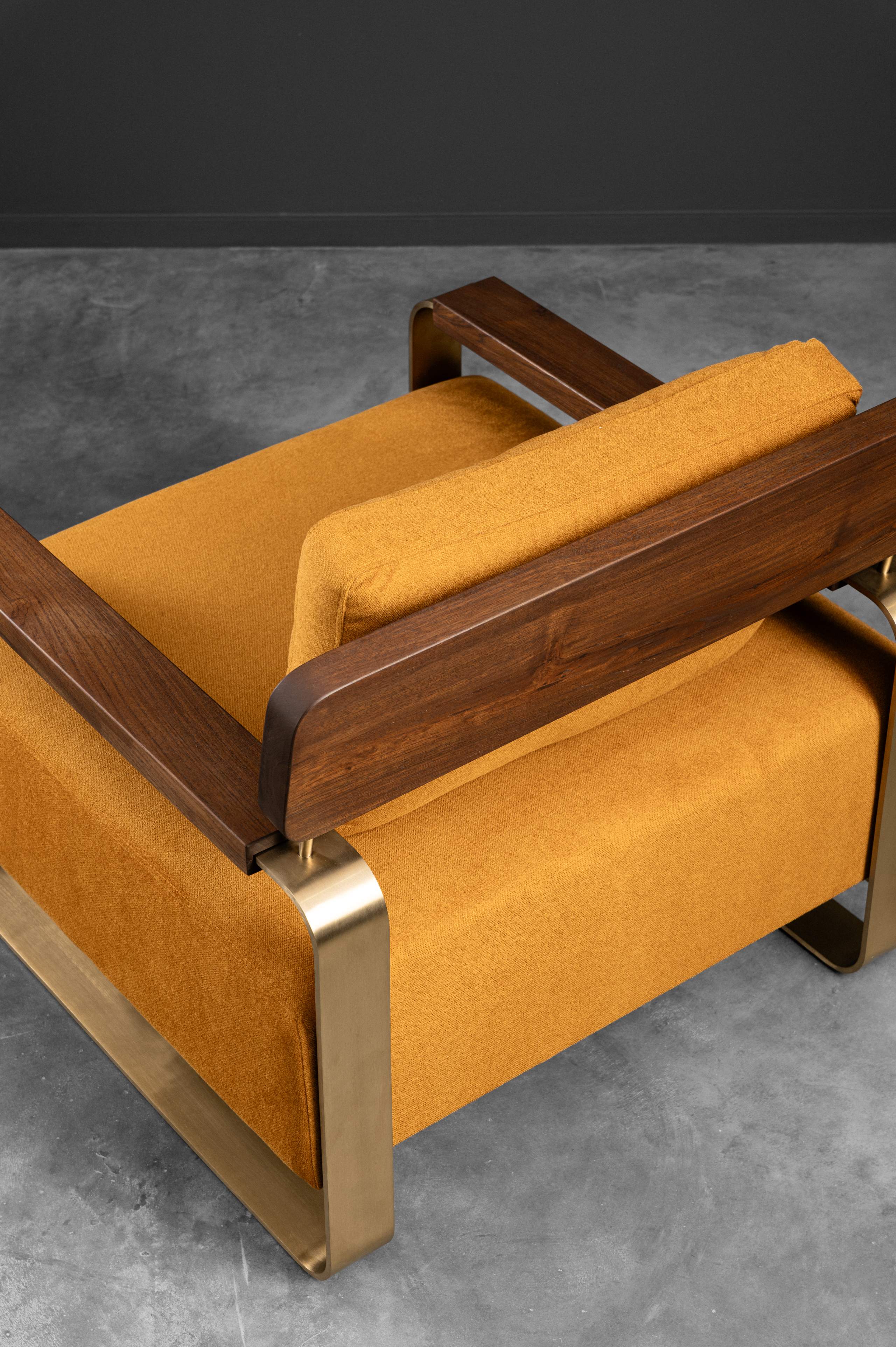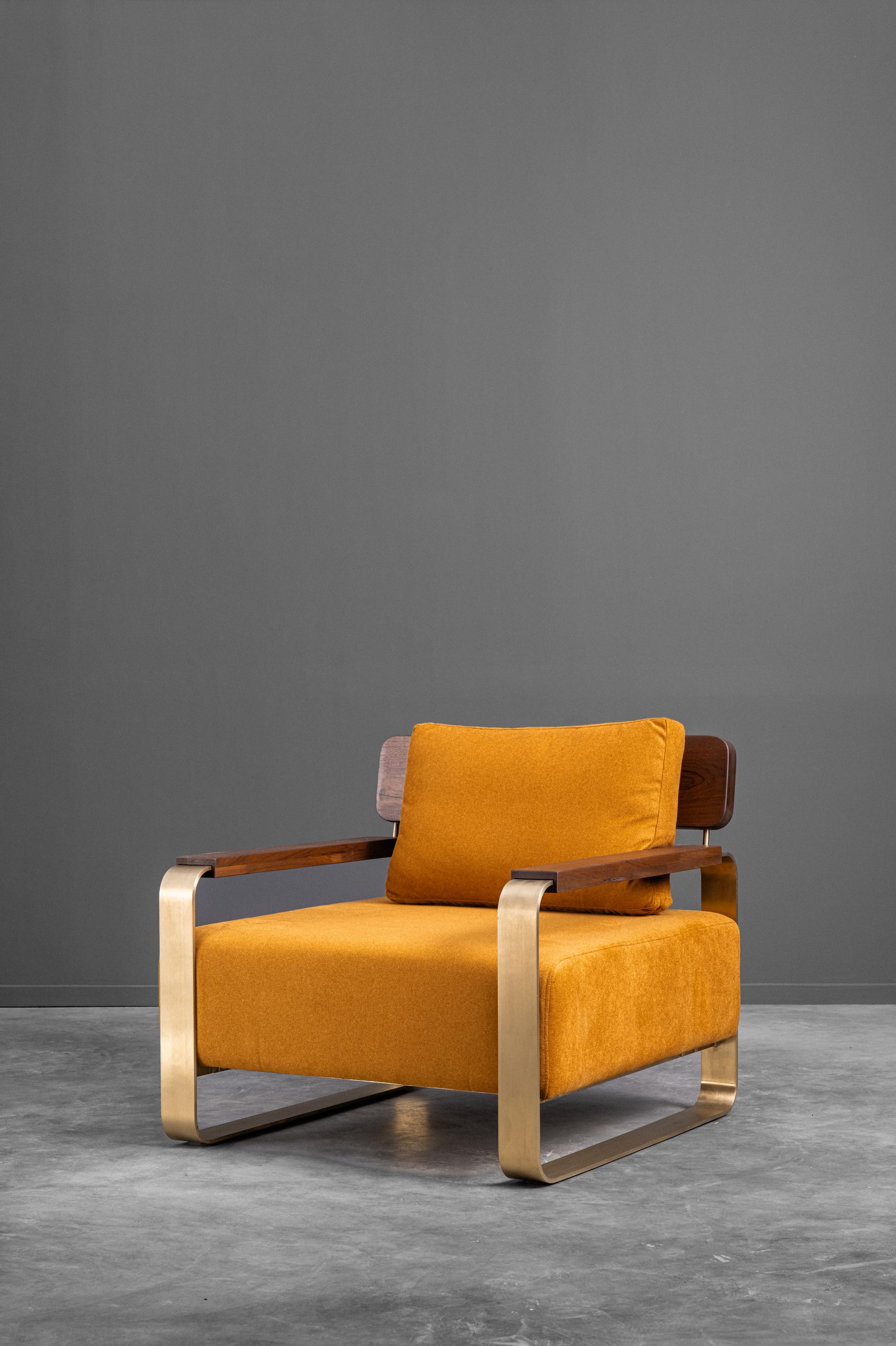 A chair defined by its bold simplicity and striking material interplay. The Confort single seater pairs a richly upholstered seat with sweeping metal legs that loop gracefully to form its base. The curved wooden backrest and slim wooden arms soften the geometry, giving the piece a warm, human touch. Its generous proportions and supportive cushions make it a place to sink in and unwind, while the strong silhouette keeps it visually crisp and modern. Adaptable and expressive, it transitions effortlessly across contemporary and eclectic interiors alike.