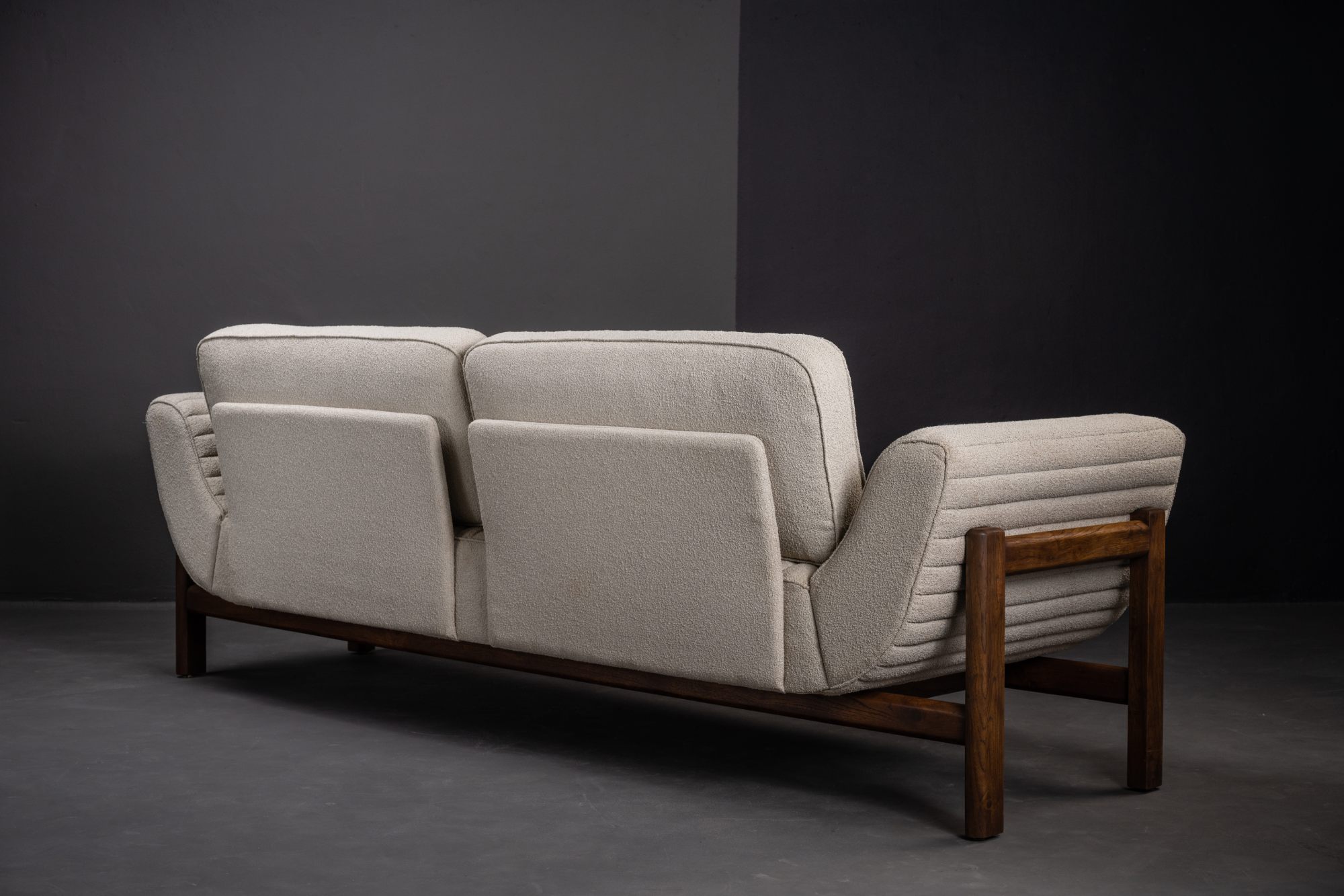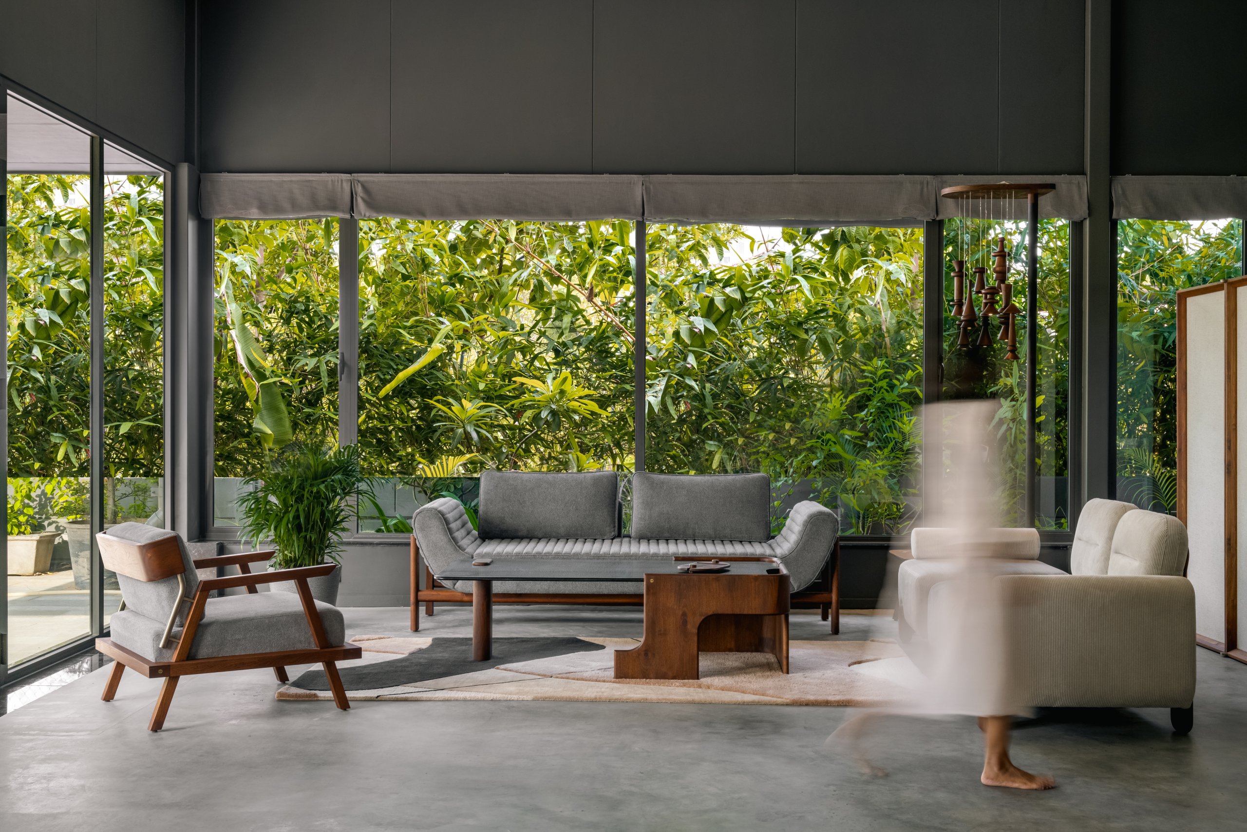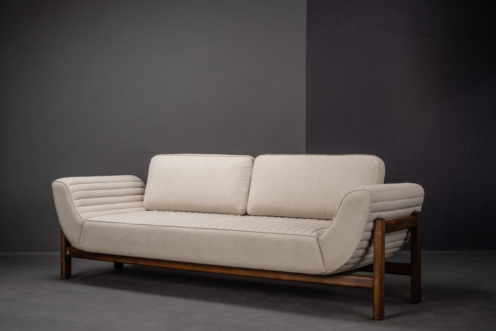 Thanks to the sleekness of the teakwood legs and thickness of the upholstery, the twill sofa becomes reminiscent of a hammock. The perfect place to begin a movie and fall asleep with your head supported by the gently curving, pillow-like armrest. The thickness of the upholstery is subdued by the fluted textures that enrich the tactile experience of running your hands over the fabric. The Twill sofa’s minimal and versatile design makes it suitable for all kinds of gathering spaces that also double as personal lounge spaces.