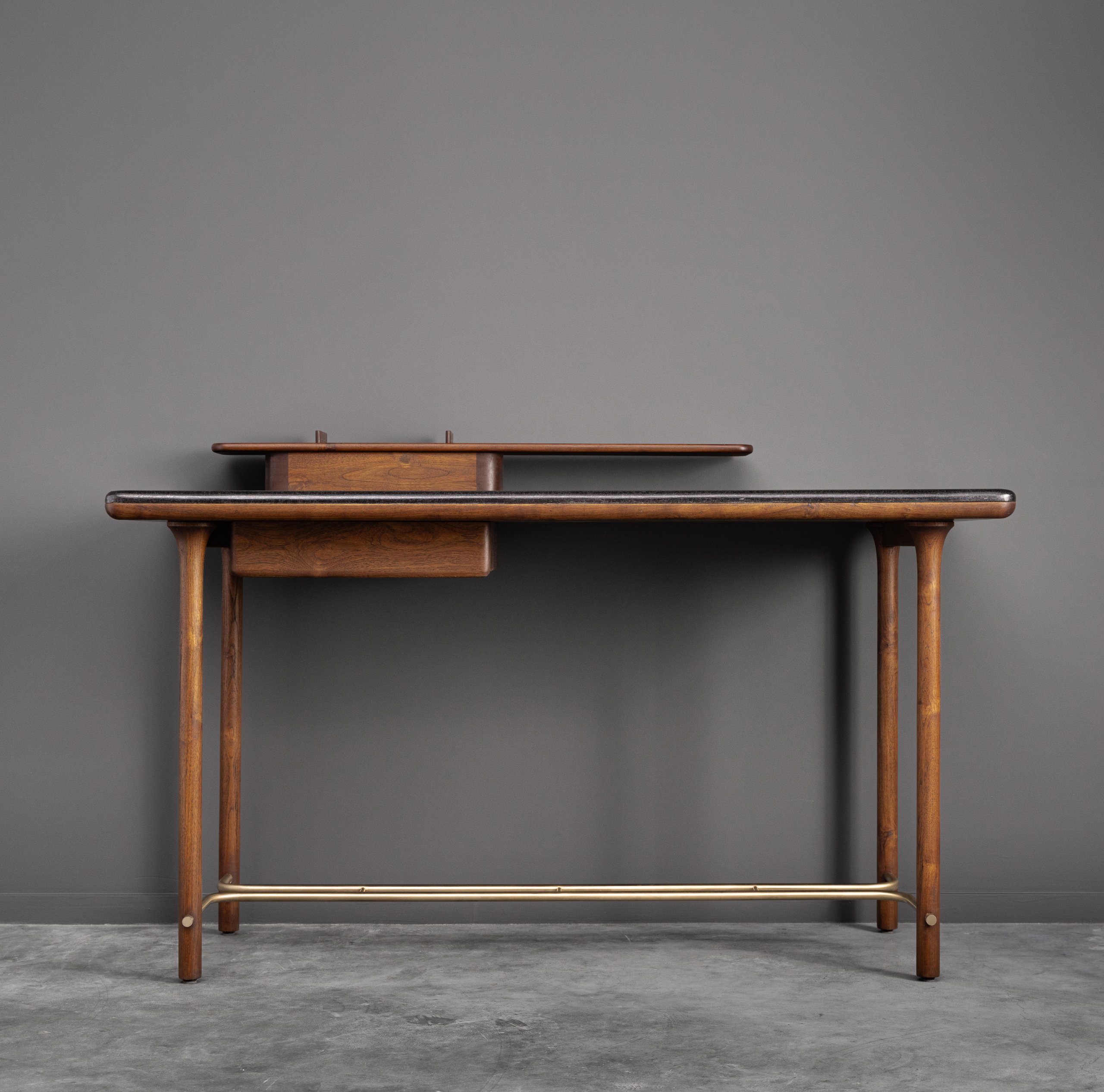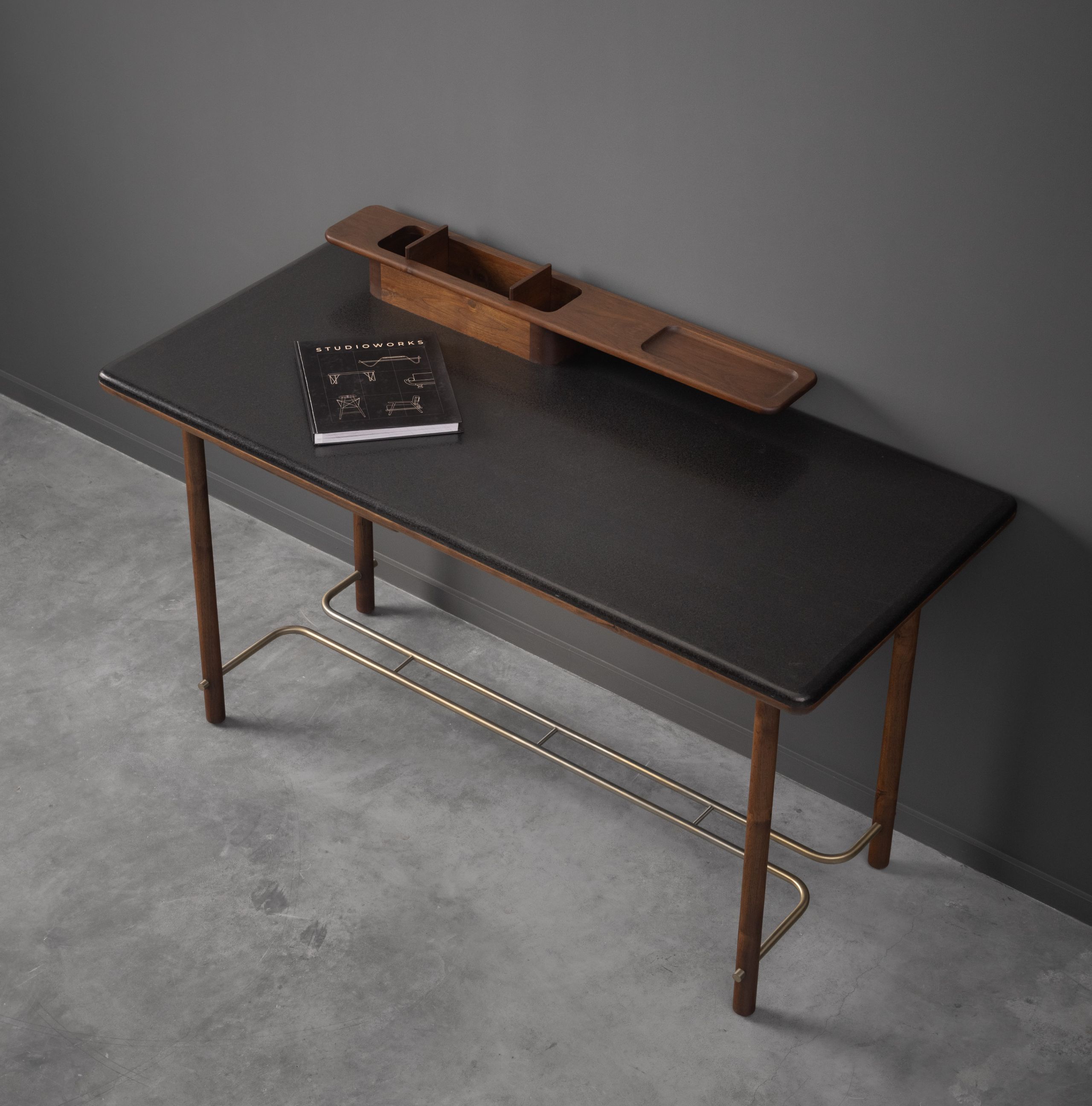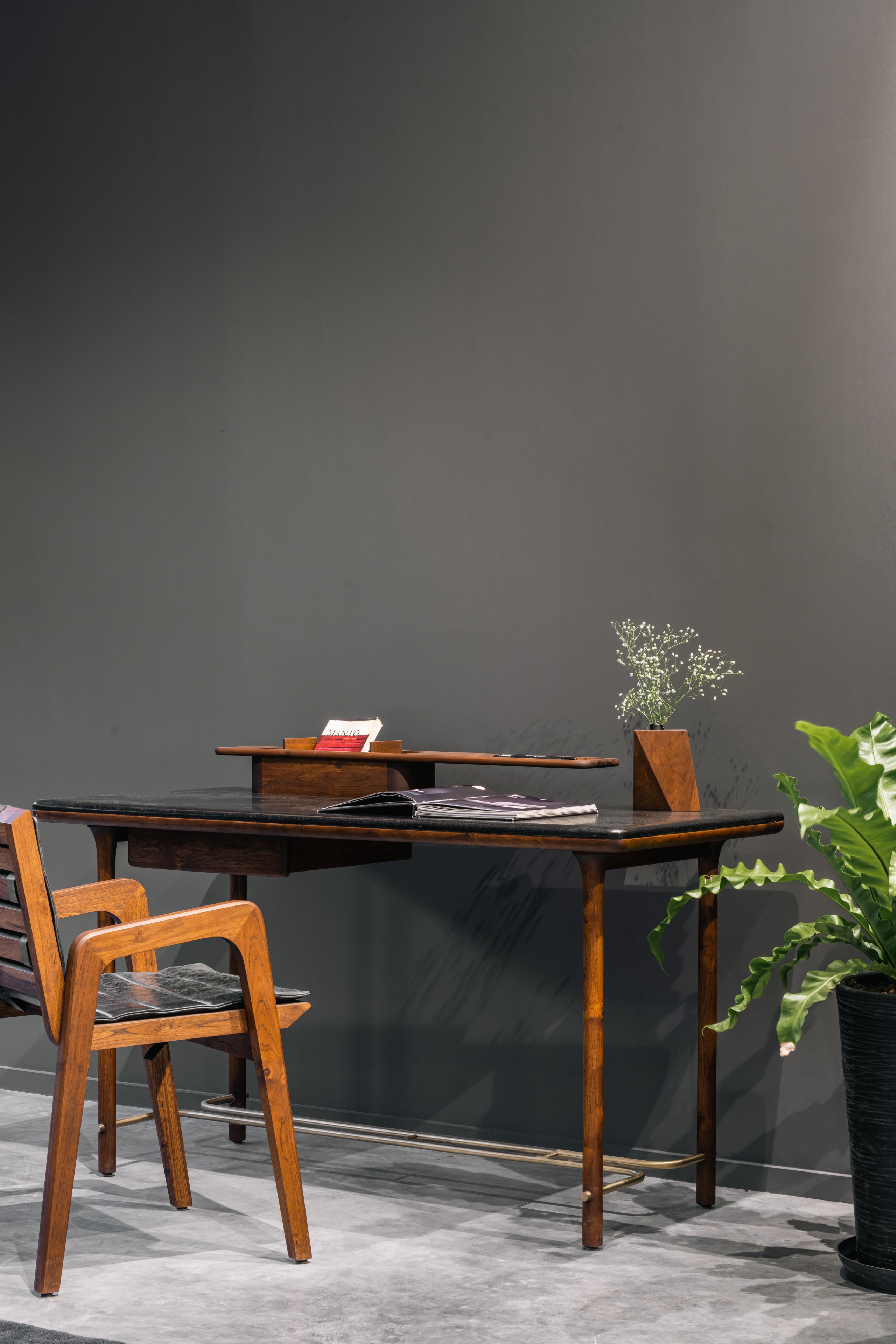 This elegant study table blends natural and industrial elements for a sleek, functional design. It features a solid wooden frame, smooth stone tabletop, and brass-finished footrest for comfort and style. An integrated accessory stand provides convenient space for essentials like stationery or gadgets. With its minimalist aesthetic and thoughtful details, it enhances productivity while complementing any modern workspace.